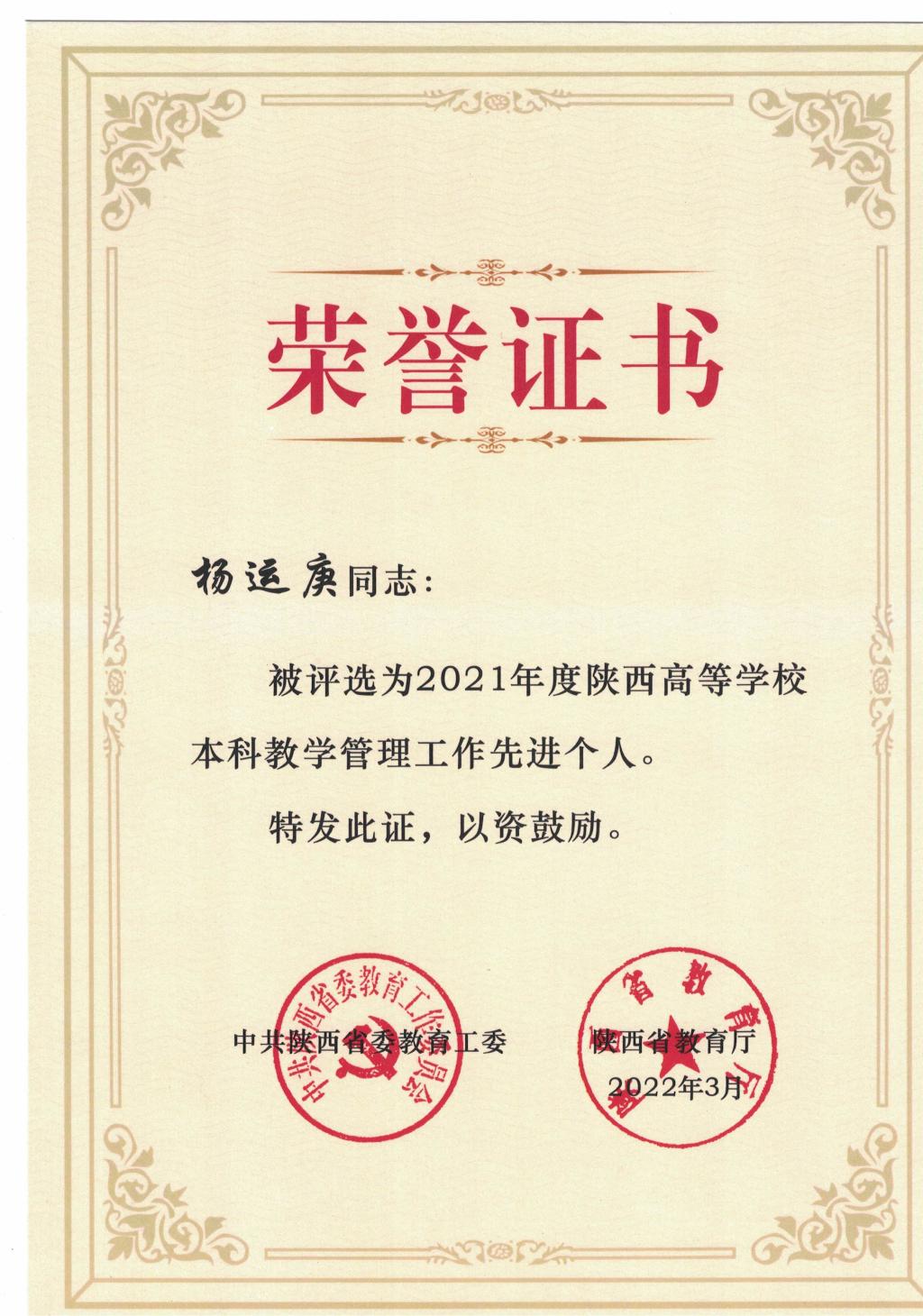导航痕迹 首页 > 师资队伍 > 教师风采 > 正文 师资概况 教师简介 兼职教授 教师风采 李春平专栏 杨运庚被评为2021年度陕西高等学校本科教学管理工作先进个人 发布人:滚球买球的app官网 发布日期:2022年06月07日 阅读次数: