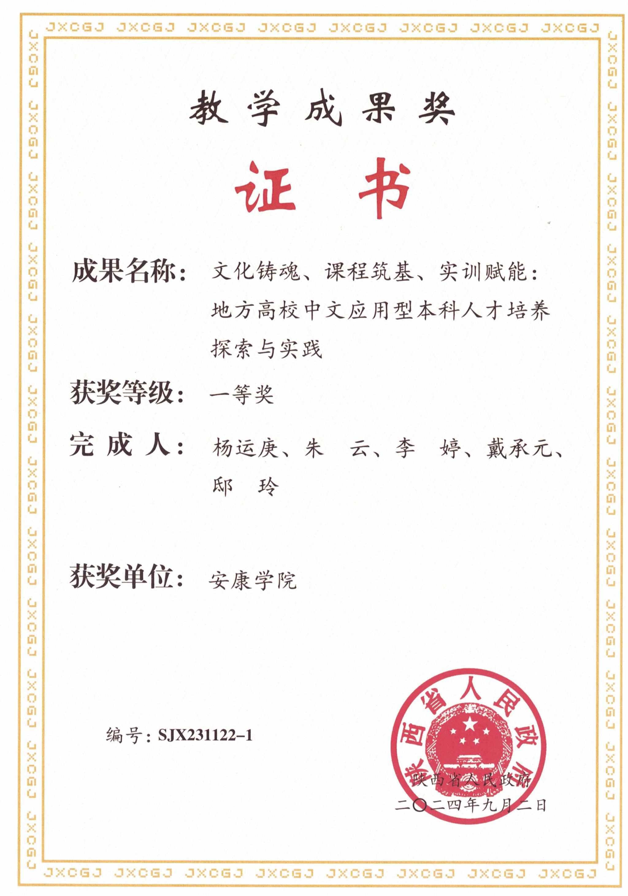 近日,陕西省人民政府发布了《陕西省人民政府办公厅关于表彰2023年高等教育教学成果奖获奖项目的通报》,滚球买球的app官网杨运庚教授领衔申报的“文化铸魂、课程筑基、实训赋能:地方高校中文应用型本科人才培养探索与实践”荣获陕西省高等教育教学成果一等奖,获奖等次取得了新的重大突破,彰显了滚球买球官网在中文应用型本科人才培养改革探索上取得的实效。
