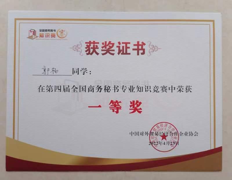 2022年4月23日,滚球买球官网秘书学专业学生参加了“第四届全国商务秘书专业知识竞赛”,再创佳绩。郭杨同学获竞赛一等奖,张雪怡、陈玉静、赵花蕊、刘佳楠、郭岩5名同学获竞赛二等奖,佘海茹、唐磊、赵龙洋、杨豪苗等17名同学获竞赛三等奖,耿世杰、王米娜等11名同学通过资格认定获“高级商务秘书证书,滚球买球的app官网获竞赛“优秀组织奖”,况汉英老师获“优秀指导教师”。