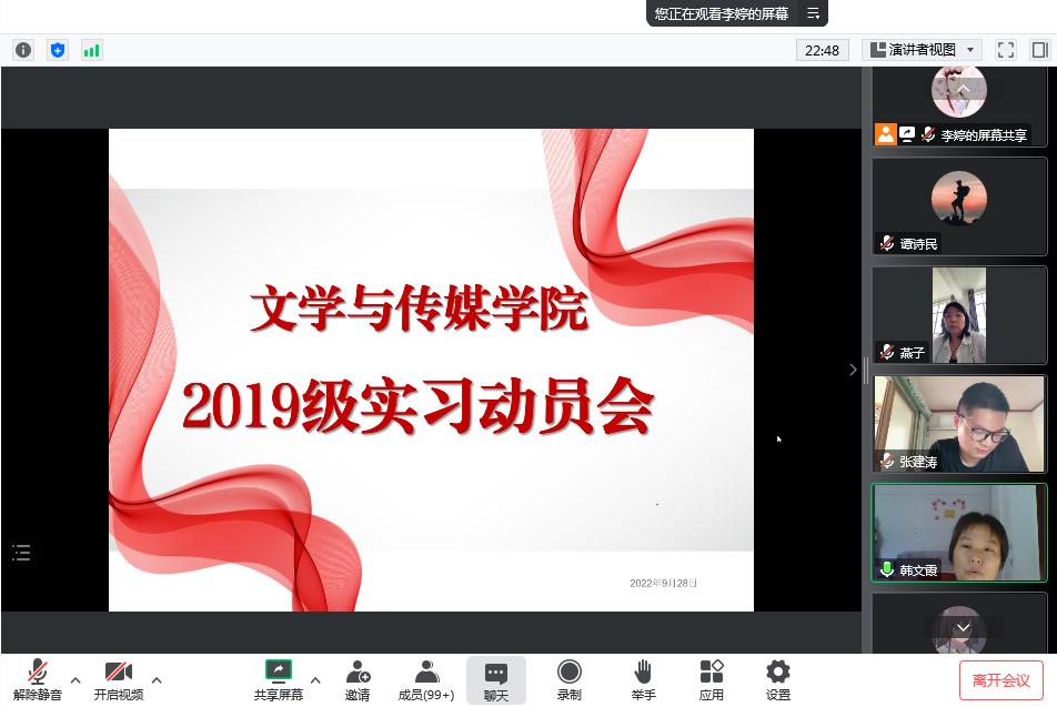 为进一步做好2019级实习工作,9月28日下午,滚球买球的app官网通过腾讯会议平台召开2019级实习动员会。学院教学副院长李婷、汉语言文学系主任韩文霞、秘书与新媒体系主任谭诗民、秘书与新媒体系副主任张建涛、学院教学秘书张燕以及2019级全体学生参加会议。