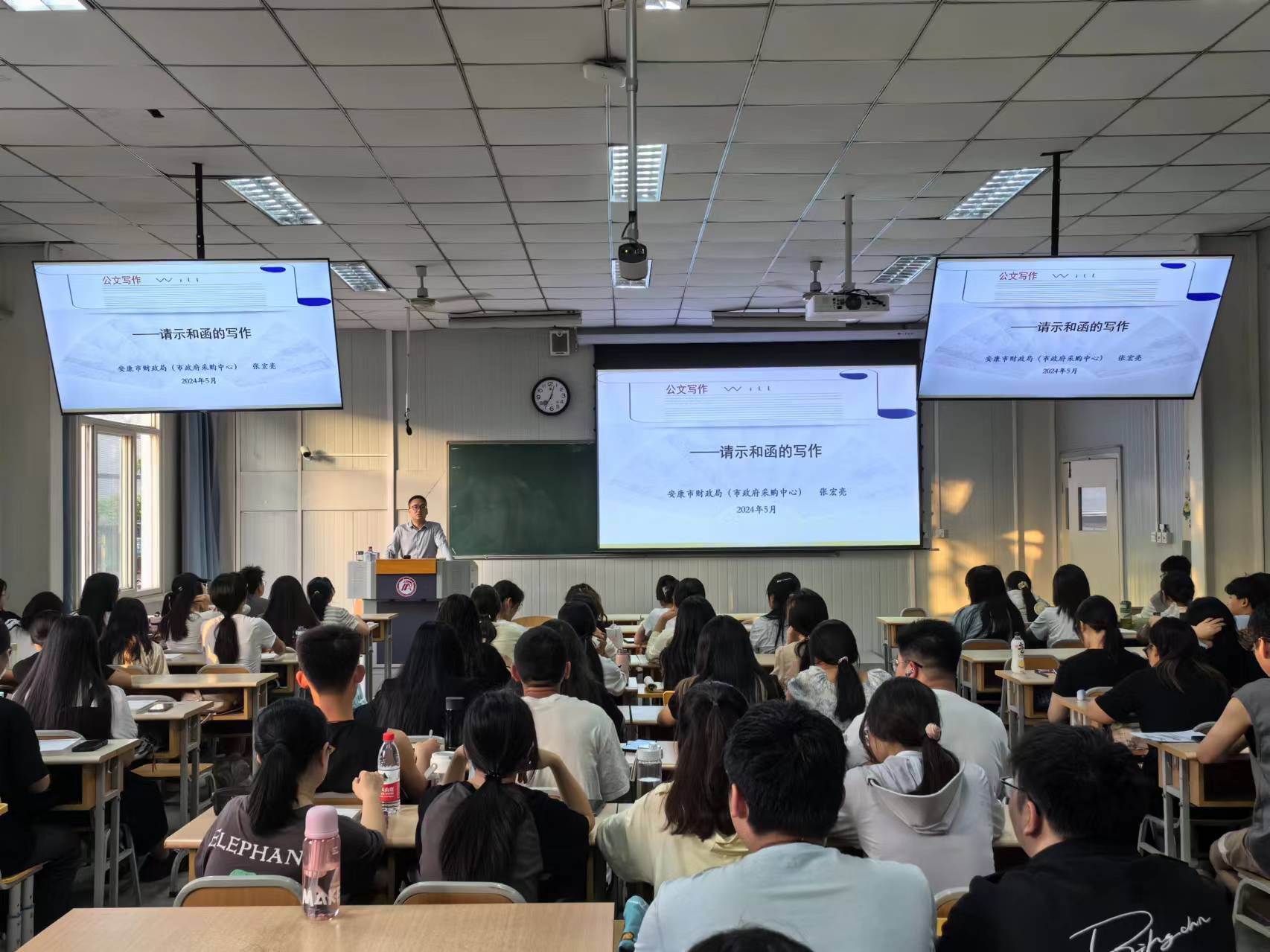 按照应用文写作“双师课程”教学计划,滚球买球的app官网分别于5月21日、28日和6月4日、11日、14日邀请课程安康市政府采购中心张宏亮为汉语言文学2023级1、2班学生讲授请示、批复、报告、函、纪要等公文和申论写作的技巧。校内任课教师胡少山随堂参与了授课。