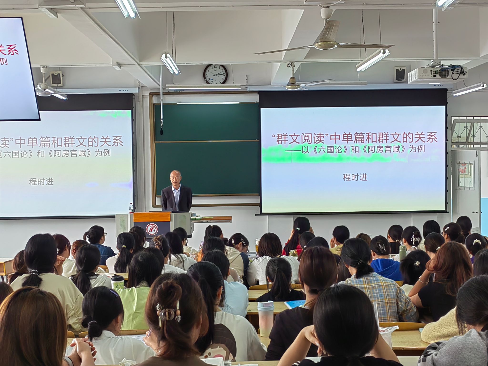 程进时老师以“群文阅读”中单篇和群文的关系为主题,以《六国论》和《阿房宫赋》为例展开讲解。程老师通过对两篇文本的深入解读,比较了两篇文本的异同点,并结合自身多年教学实践,向同学们分享了单篇阅读教学和群文阅读教学设计的经验。同时,他还结合统编教材探讨了单篇阅读和群文阅读教学之间的关系,指出了群文阅读教学实施的建议。课堂最后,程老师满怀激情地勉励同学们坚持教育理想,多阅读,多实践,锤炼过硬本领,扎实课堂教学基本功,提高自身综合素养,为职业发展奠定坚实基础。