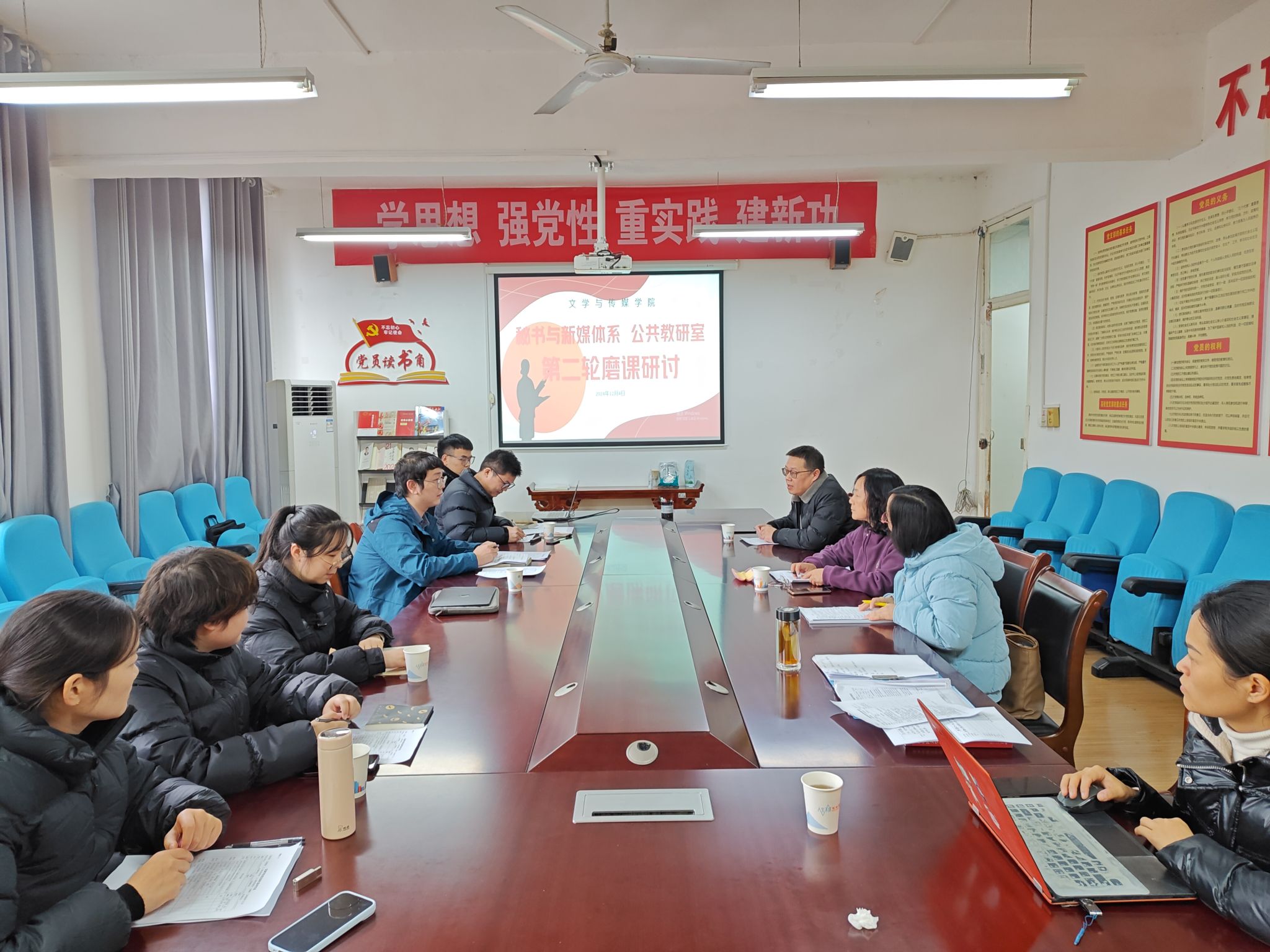 为进一步提高教师课堂教学水平,落实学校教育教学审核评估工作要求,滚球买球的app官网秘书与新媒体系、公共教研室在12月4日下午联合举办了第二轮磨课研讨活动。活动在2307会议室举行,邀请教学副院长朱云,学院教学督导赵桃、崔瑜现场评点指导,秘书与新媒体系、公共教研室全体教师参与了本轮磨课研讨活动。