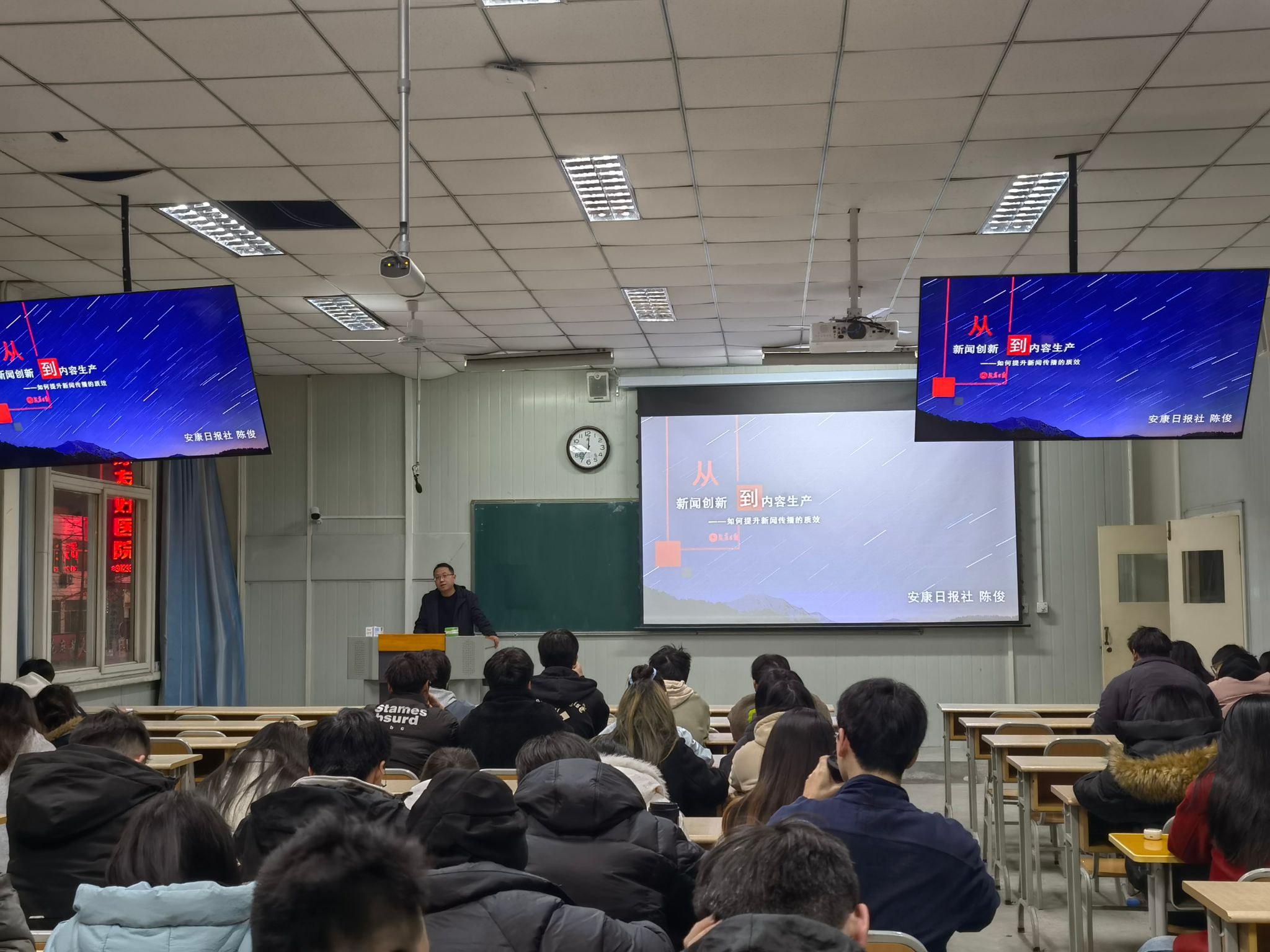 2 月 27 日,秘书与新媒体系在 1022 教室成功举办《行业企业问题讲座》第一讲。此次课程特邀安康市融媒体中心专刊编辑部主任陈俊为全系同学们带来了一场干货满满的授课。讲座聚焦于新闻创新和内容生产,旨在提升同学们对新时代新闻工作的认识和理解。