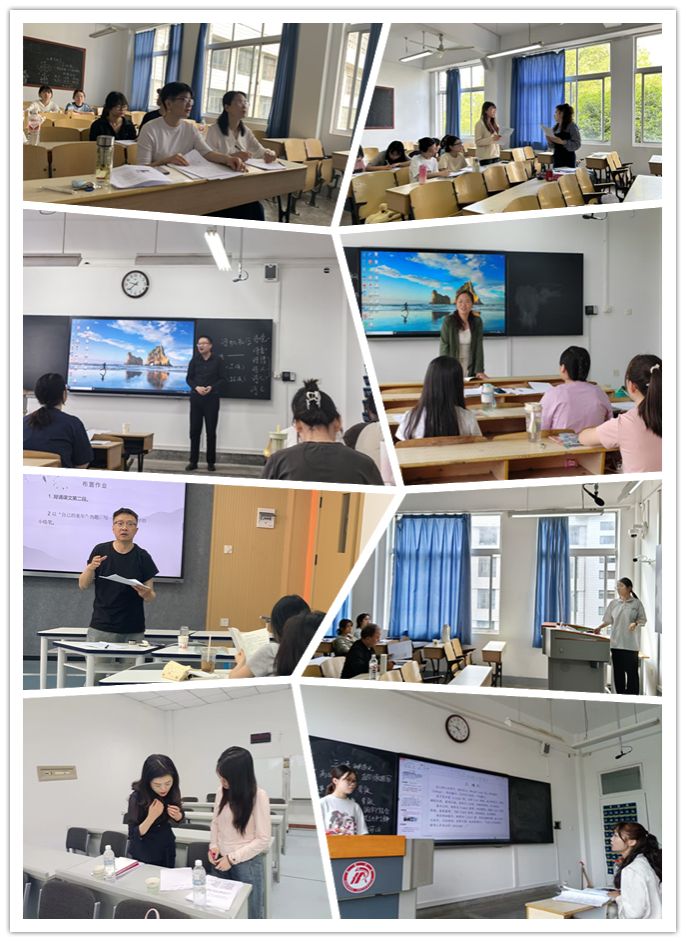 随后,16名中学语文兼职教师分赴各组,与学院专任教师一起共同指导学生第二轮试讲。在本轮试讲之前,学院专任教师已经指导学生完成第一轮试讲,本轮试讲以16名中学语文兼职教师的指导为主;兼职教师发挥他们教学经验丰富的优长,立足新课标要求和新教材特点,从课堂教学内容选择到教学目标确定,从学情把握到教学环节设计,从PPT、板书呈现到教姿教态调整,对学生的试讲进行了全方位指导,有力提升了他们的课堂教学技能。学院同堂指导的专任教师在与行业教师的交流碰撞中深化了对目前中学语文教学的认知,他们将结合学生第二轮试讲情况,完成最后一轮试讲指导工作。
