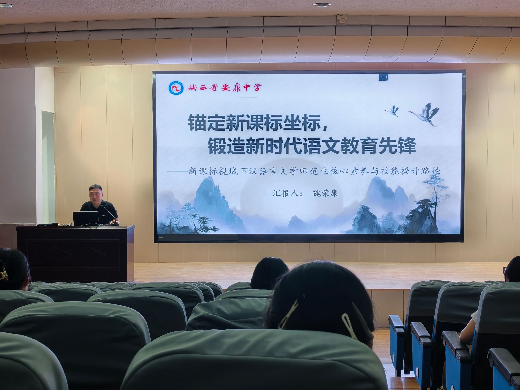 为助力汉语言文学师范生适应新课标要求,提升教育教学能力,5月7日滚球买球的app官网在江南校区一号楼报告厅举办了题为"新课标视域下汉语言文学师范生核心素养与技能提升路径"的专题讲座。本次活动邀请安康中学魏荣康老师主讲,汉语言文学系主任谭诗民博士主持,2022级全体师范生现场听取了报告。