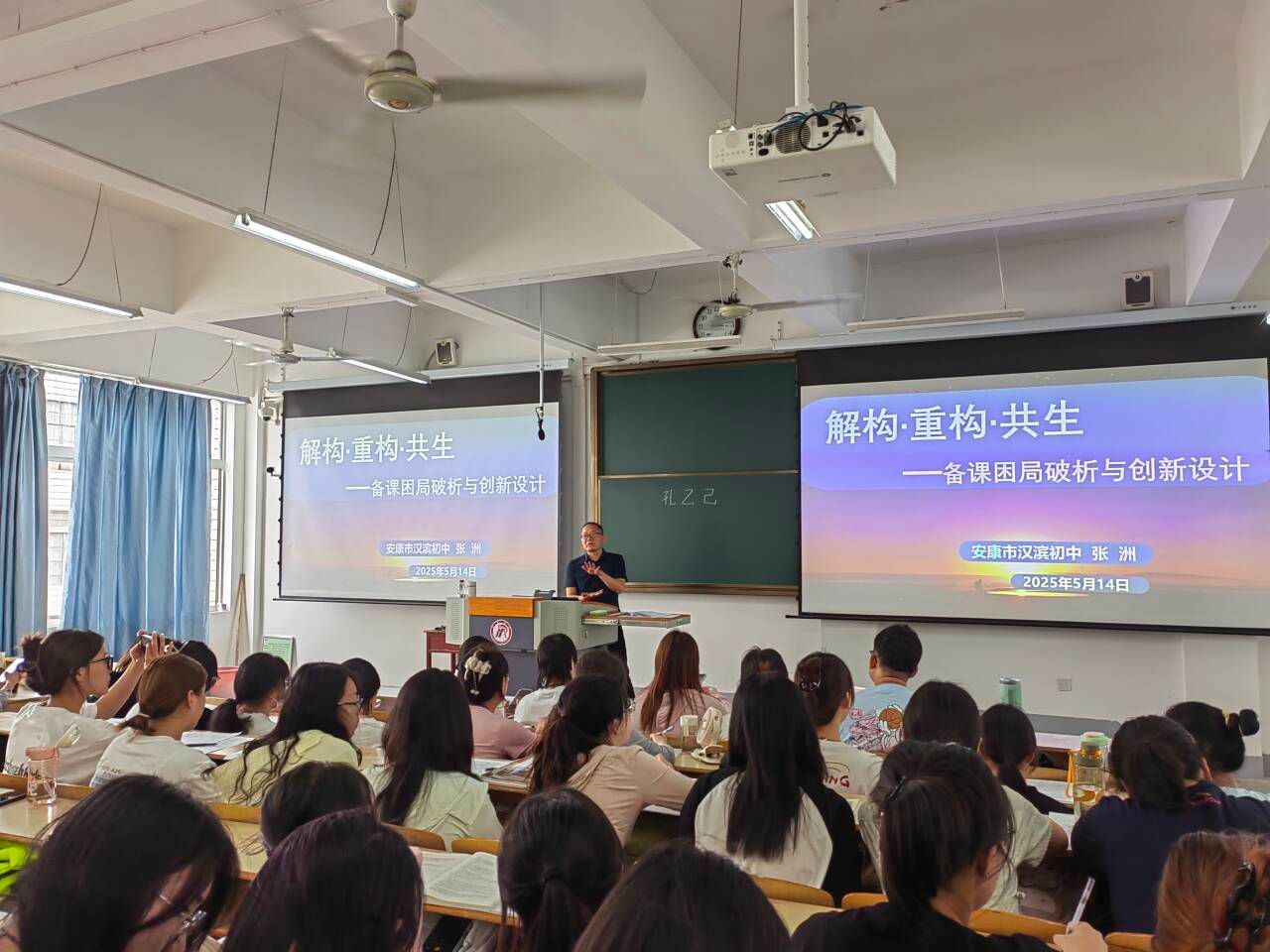 2025年5月14日下午,滚球买球的app官网在江南校区1510教室举办了《孔乙己》示范课展示及“解构·重构·共生——备课困局破析与创新设计”专题讲座活动。本次活动特邀陕西省教学能手、汉滨初级中学张洲老师主讲,班主任唐明珍和第四届“中学语文卓越师资班”全体学员及部分毕业生共同参与。