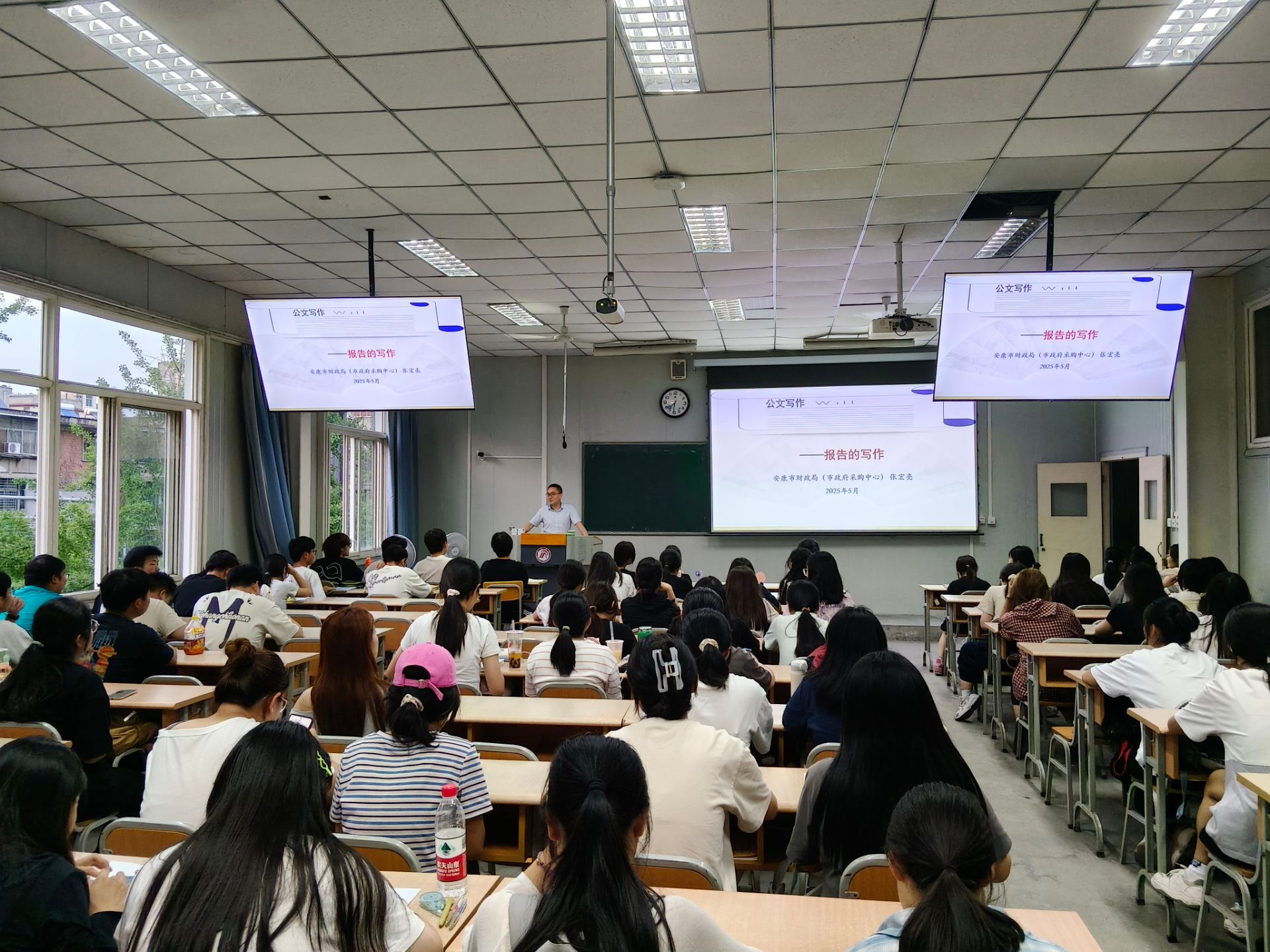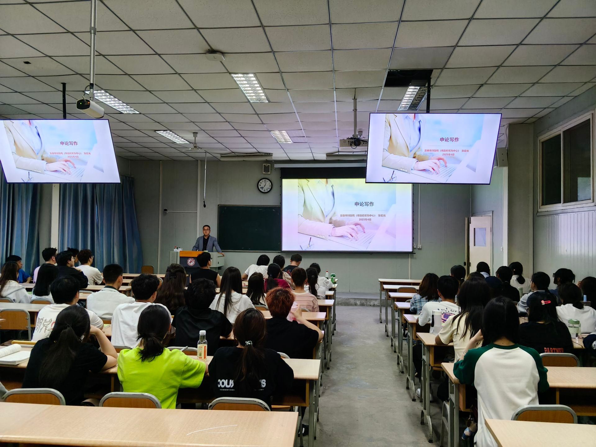 按照《应用文写作》“双师”课程教学计划,滚球买球的app官网于4月9日、4月18日、5月20日、6月3日邀请行业专家安康市政府采购中心张宏亮,为汉语言文学2024级1、2、5班学生分四次讲授了请示、批复、报告、函、纪要等公文和申论写作的技巧,校内任课教师胡少山随堂听课。