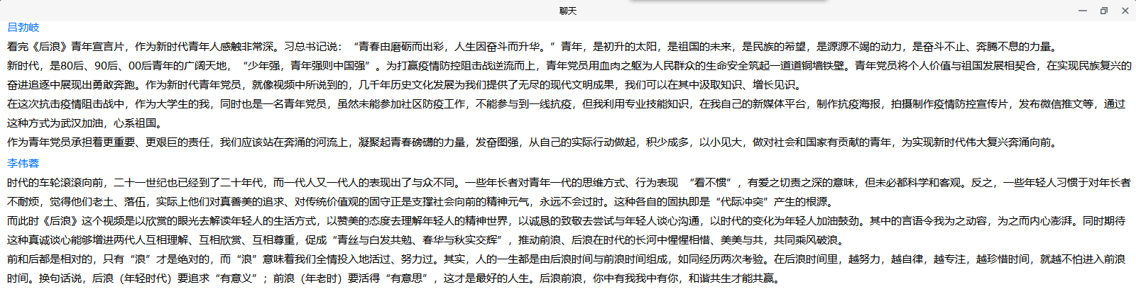 2017级网媒专业党员吕勃岐谈到,在视频中,我看到了青春与奋斗。作为新一代青年要有理想,有担当,有本领;作为“后浪”要始终保持艰苦奋斗的前进姿态,在新时代的大潮中勇立潮头,作新时代前列的青年奋斗者、开拓者、奉献者。发奋图强,从自己的实际行动做起,积少成多,以小见大,作对社会和国家有贡献的青年。