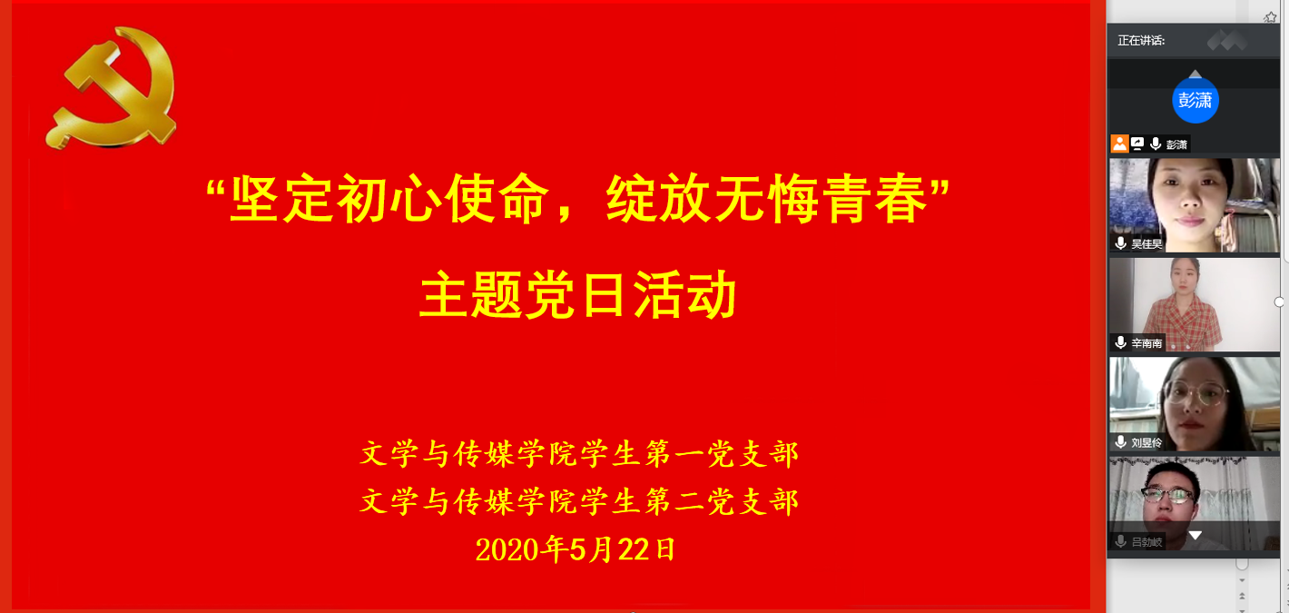 为进一步规范党内的组织生活,深入推进“两学一做”学习教育常态化、制度化,激励党员树立崇高理想,坚定理想信念,2020年5月22日下午16:30,滚球买球的app官网学生第一、第二党支部通过线上形式,联合开展了“坚定初心使命,绽放无悔青春”主题党日活动。学生第一、第二党支部全体党员、第二十期发展对象参加了本次活动。活动由学生第一党支部书记彭潇主持。