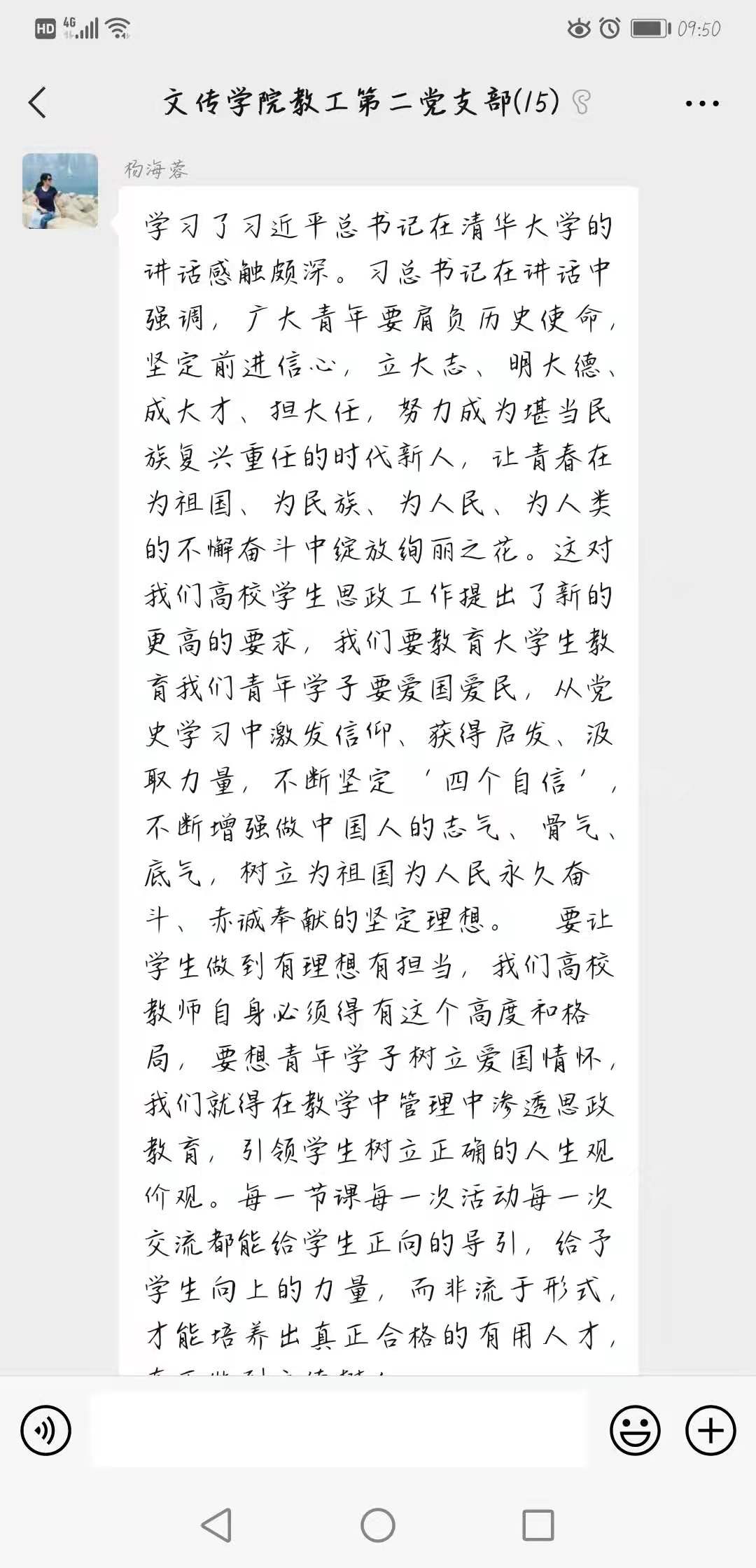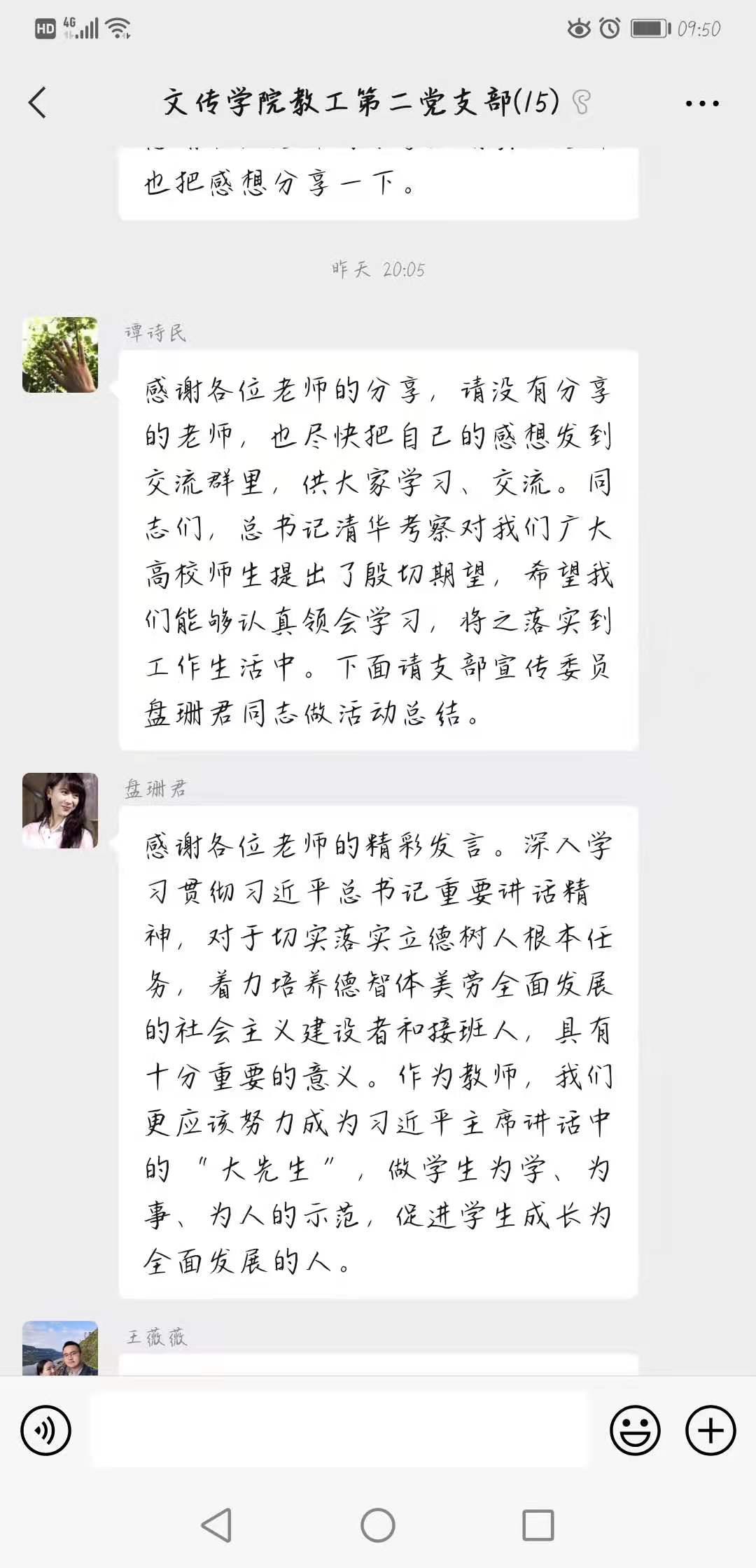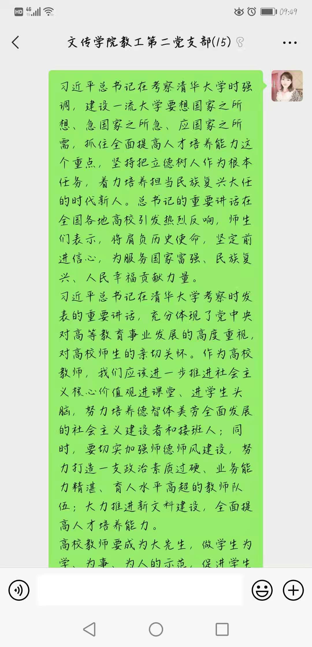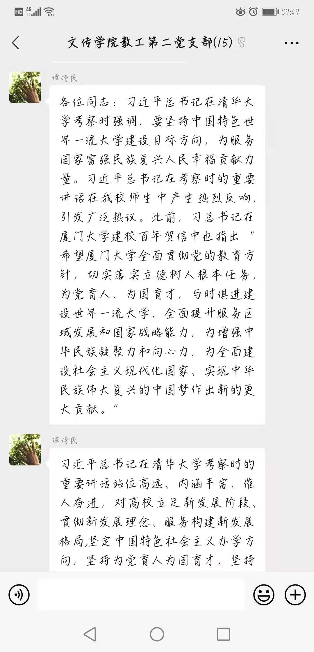 4月29日,滚球买球的app官网教工二支部依托支部微信平台开展了“深入学习习近平总书记清华考察重要讲话,牢固树立高校‘立德树人’根本任务”主题党日活动。活动由教工二支部书记谭诗民主持,支部全体党员共同学习并参与讨论。
