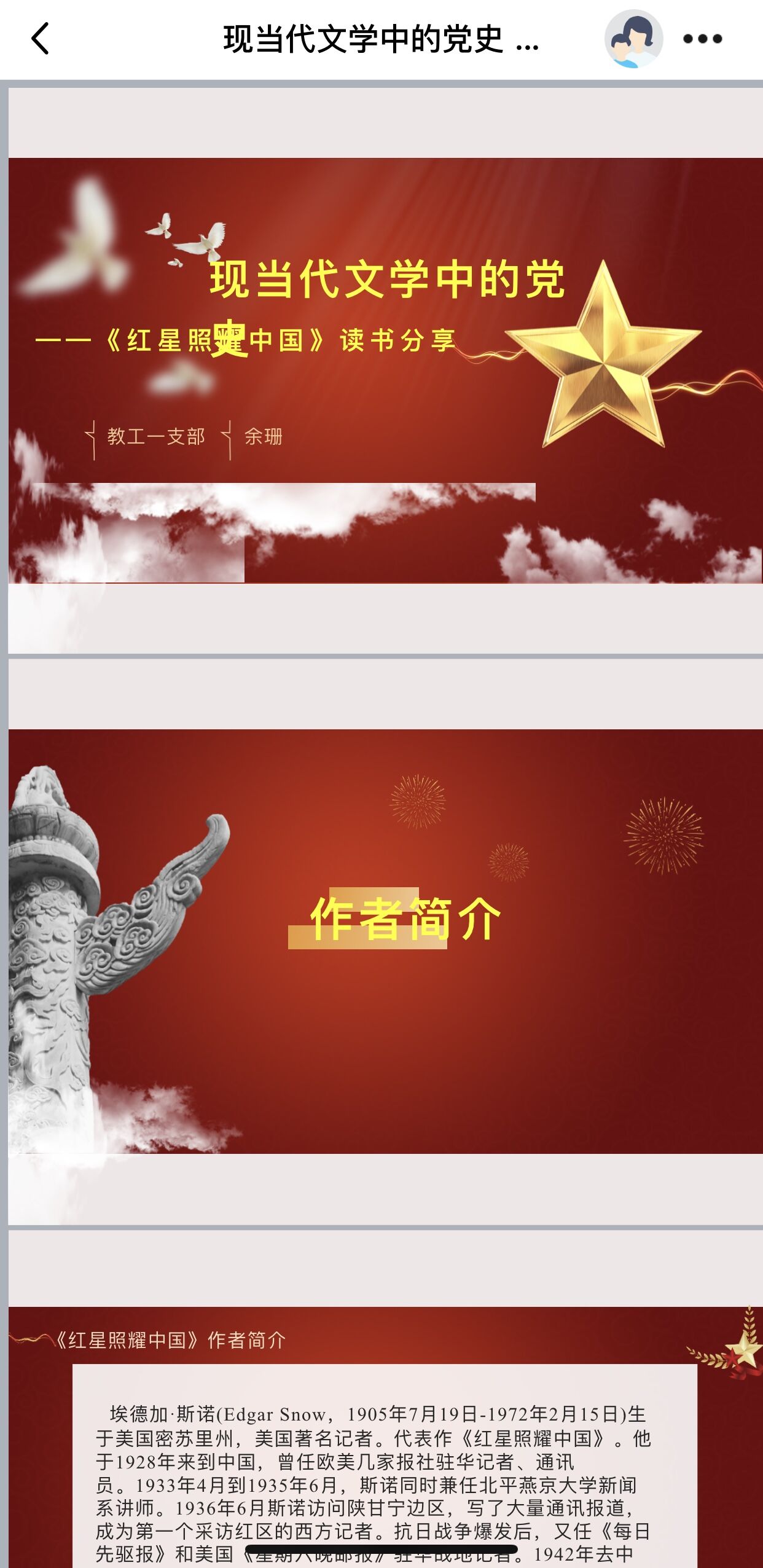 2021年10月13日晚7时,滚球买球的app官网教工一支部党员利用QQ群展开线上学习,继续开展“现当代文学中的党史”党员读书专题活动,本次活动由一支部党员余珊同志为大家分享《红星照耀中国》中的党史。
