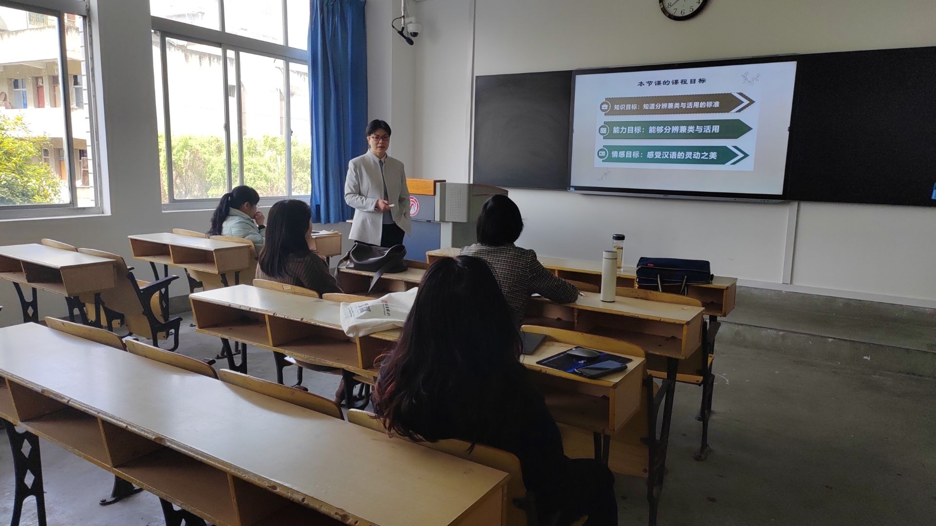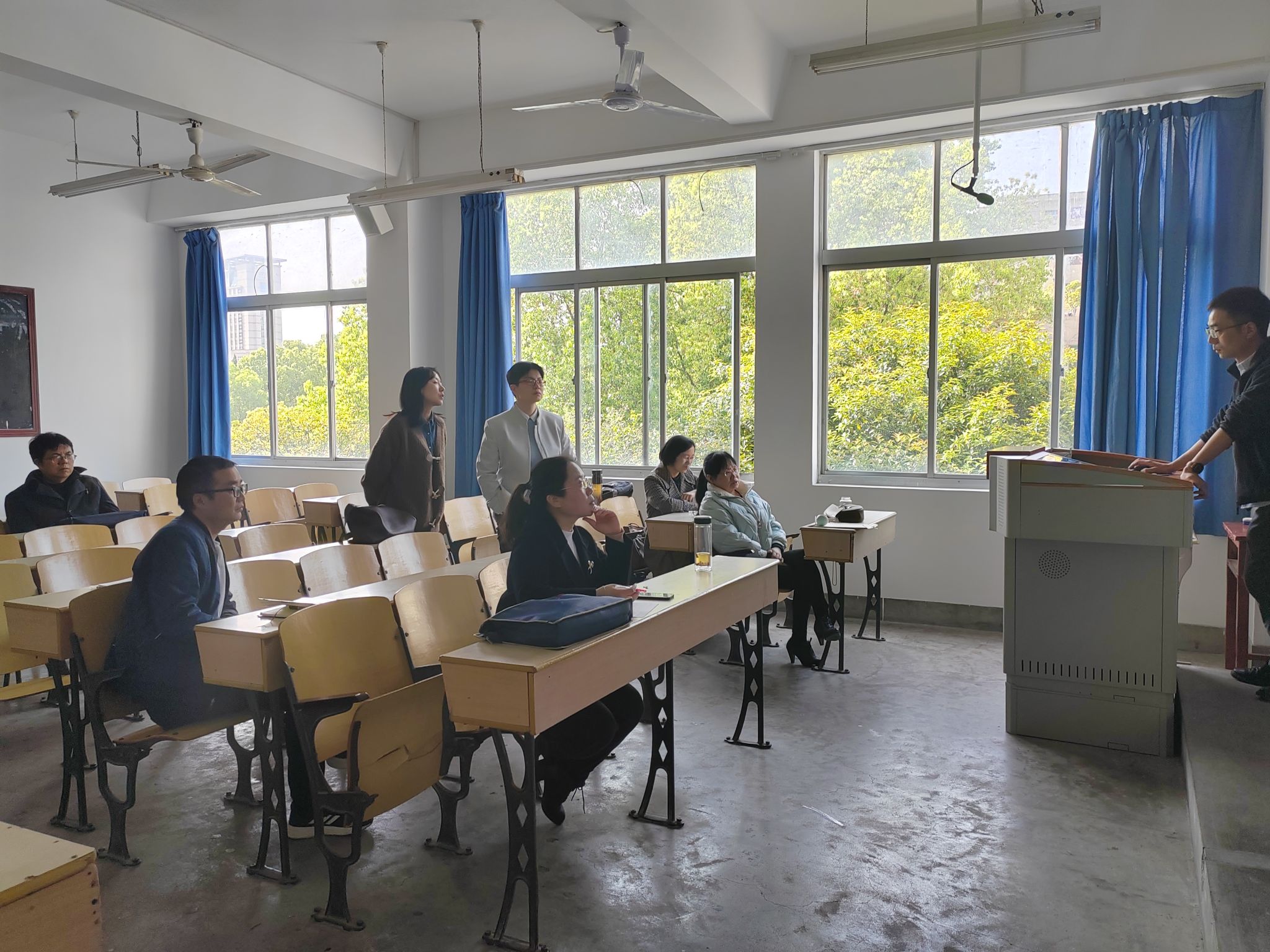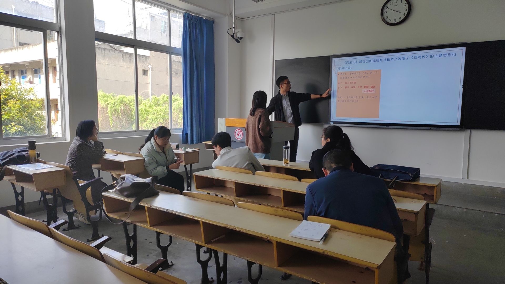 院系教学督导孙鸿、邸玲,省级课程思政示范课程“古代汉语”教师周海霞亲临现场指导,他们把教学活动中好的经验做法展示出来,具体讲解如何在教学设计的每个环节落实“学生中心”的师范专业认证理念,如何利用学堂在线、慕课堂等信息技术平台调动学生的积极性,如何在课件的制作方面吸引学生的注意力等方面亲自示范,为在场的教师们起到了模范带头作用。语言类、文学类、写作类课程教师也纷纷结合各自的课程特点谈了各自的教学设计,提出困惑和思考,积极进行了学习交流。