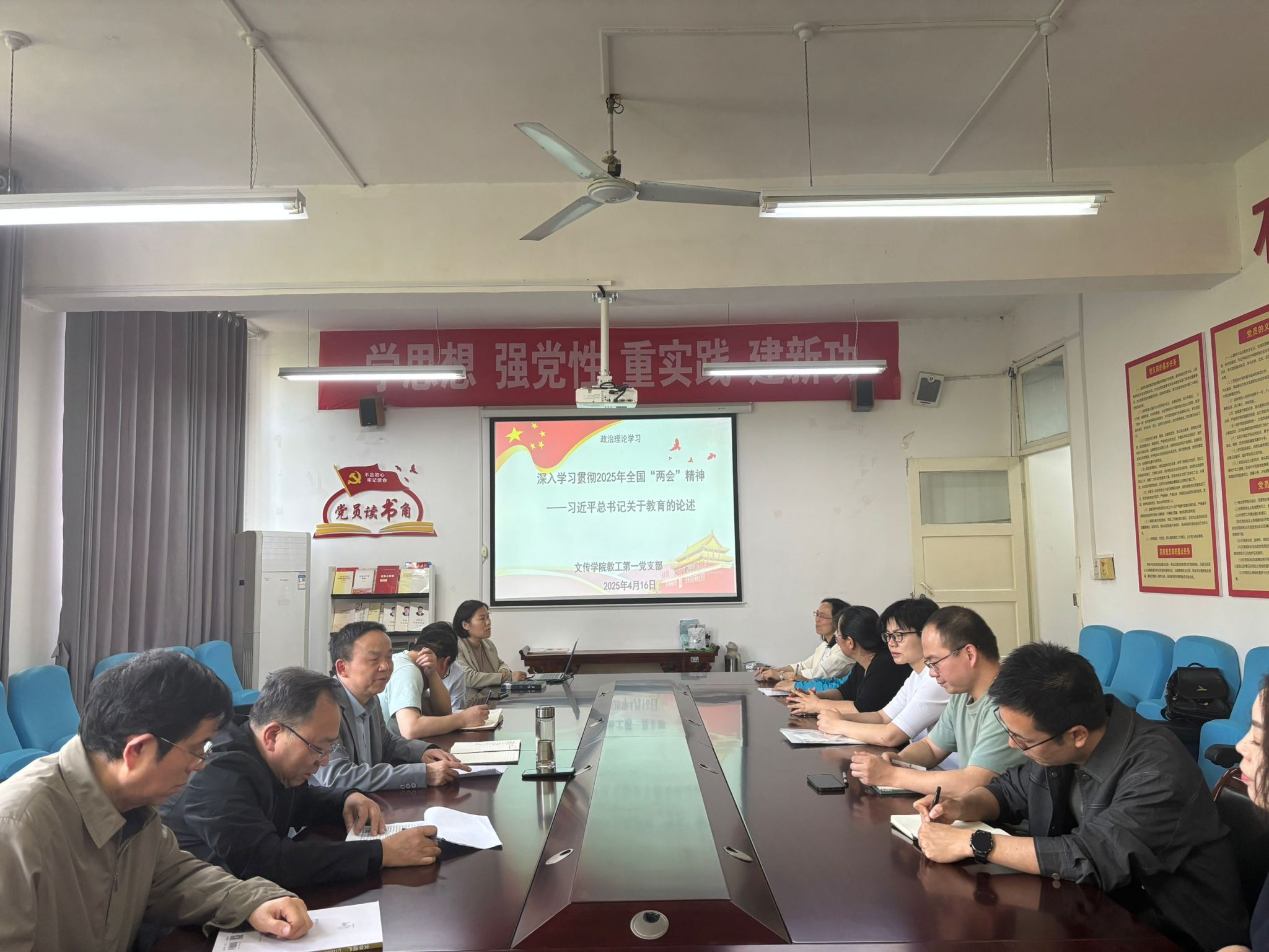 为深入学习贯彻全国“两会”精神,进一步提升党员的政治素养和责任意识,4月16日下午,滚球买球的app官网教工第一党支部组织开展了以“深入学习贯彻2025年全国‘两会’精神——习近平总书记关于教育的论述”为主题的党日活动,活动由支部书记韩文霞主持,支部全体党员参加。此次活动采取集中学习、视频观看、交流研讨等多种方式,引导党员深入领会全国“两会”精神,把握国家发展方向,激发党员同志的工作动力和热情,提升党员教师的思想觉悟,强化学院党建工作。