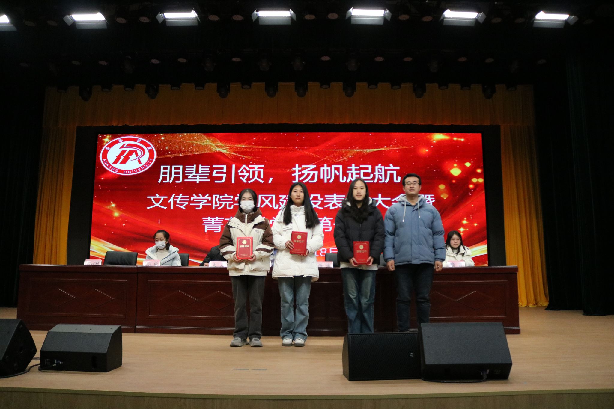 颁奖仪式后,学生代表们依次上台交流分享学习经验。汉语言文学2022级4班郑红阳围绕“大学平衡术”展开交流分享,她鼓励同学们积极实践、勇于试错,成就更好的自己。秘书学2022级1班王文康用幽默的语言分享他的“四小法宝”,激励大家拒绝“摆烂”心态,明确目标、立即行动。网络与新媒体2023级1班崔嘉睿通过亲身经历讲述“在远方 在路上”的感悟与体会,号召大家勇于实践,敢于担当,在学习和实践中提升自己的专业素养。