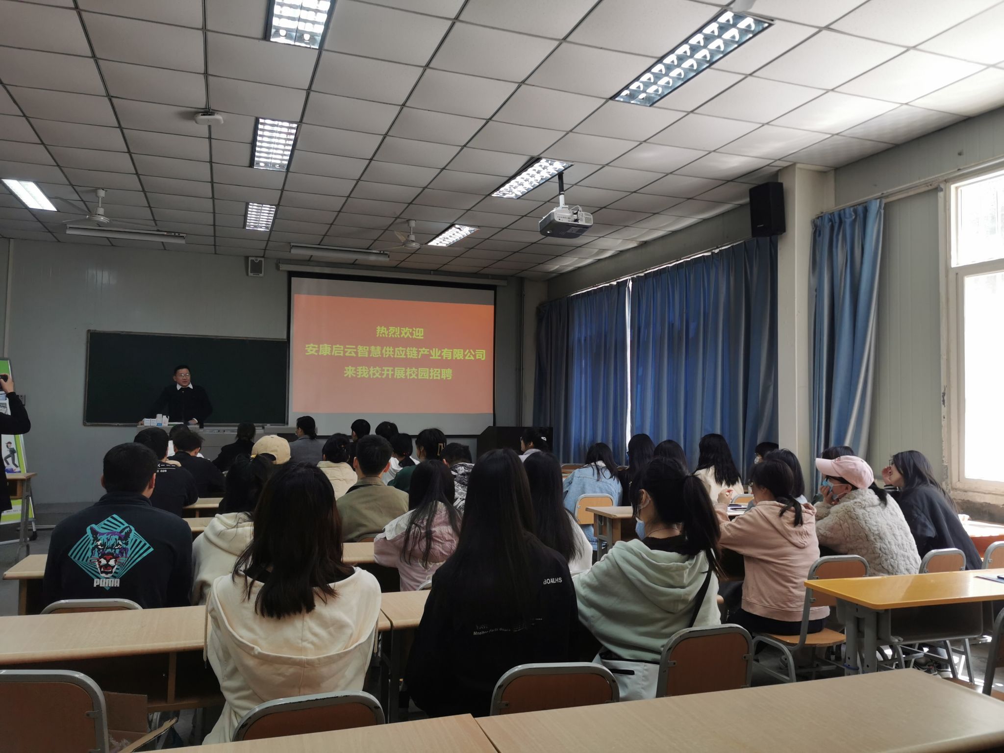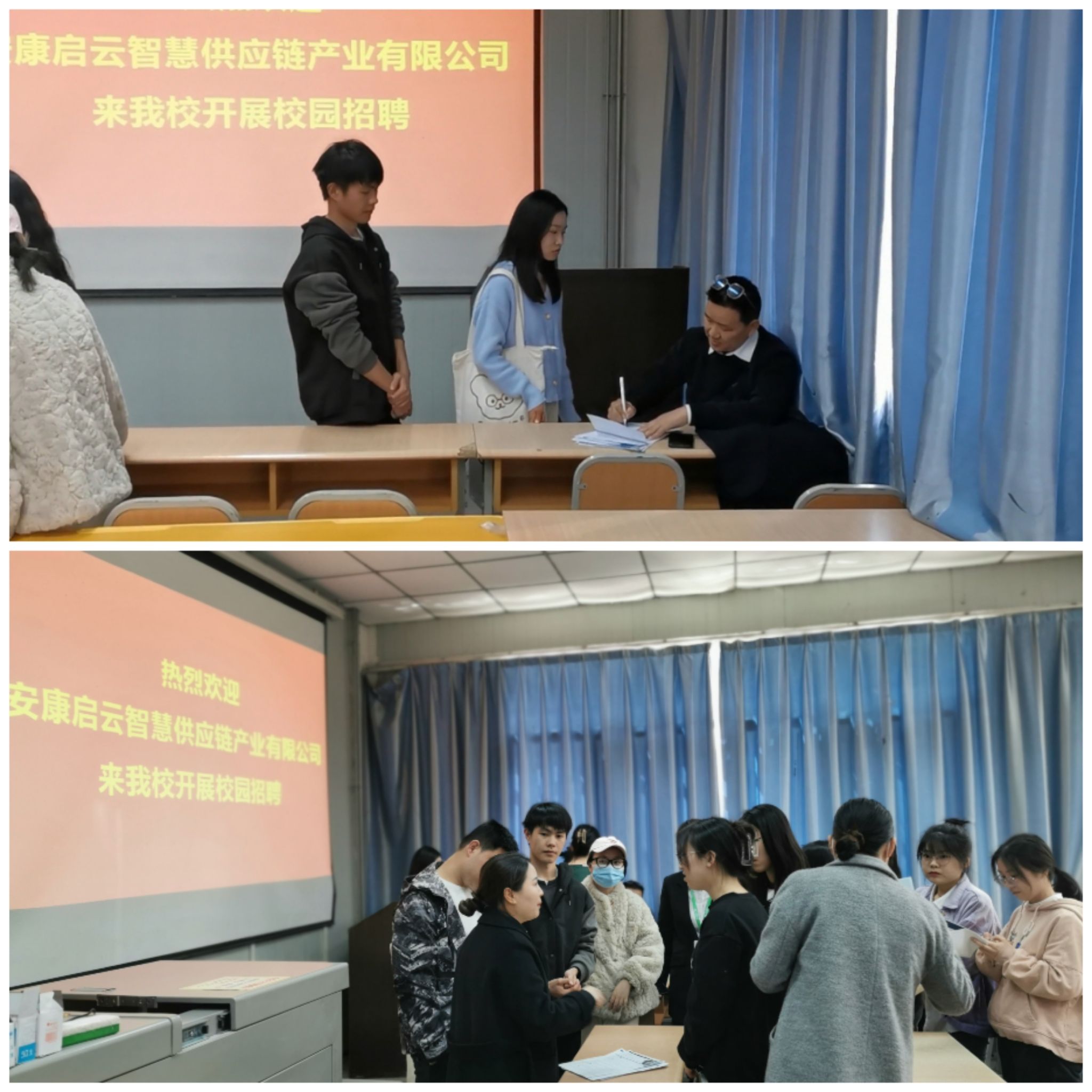 安康启云智慧供应链产业有限公司负责人兰凤华先生向同学们介绍了公司概况和岗位需求及薪酬福利待遇等。参加招聘会的同学们就各自感兴趣的领域及问题与用人单位进行了交流,积极向用人单位投递简历并进行了初步面试,现场达成就业意向10余人。