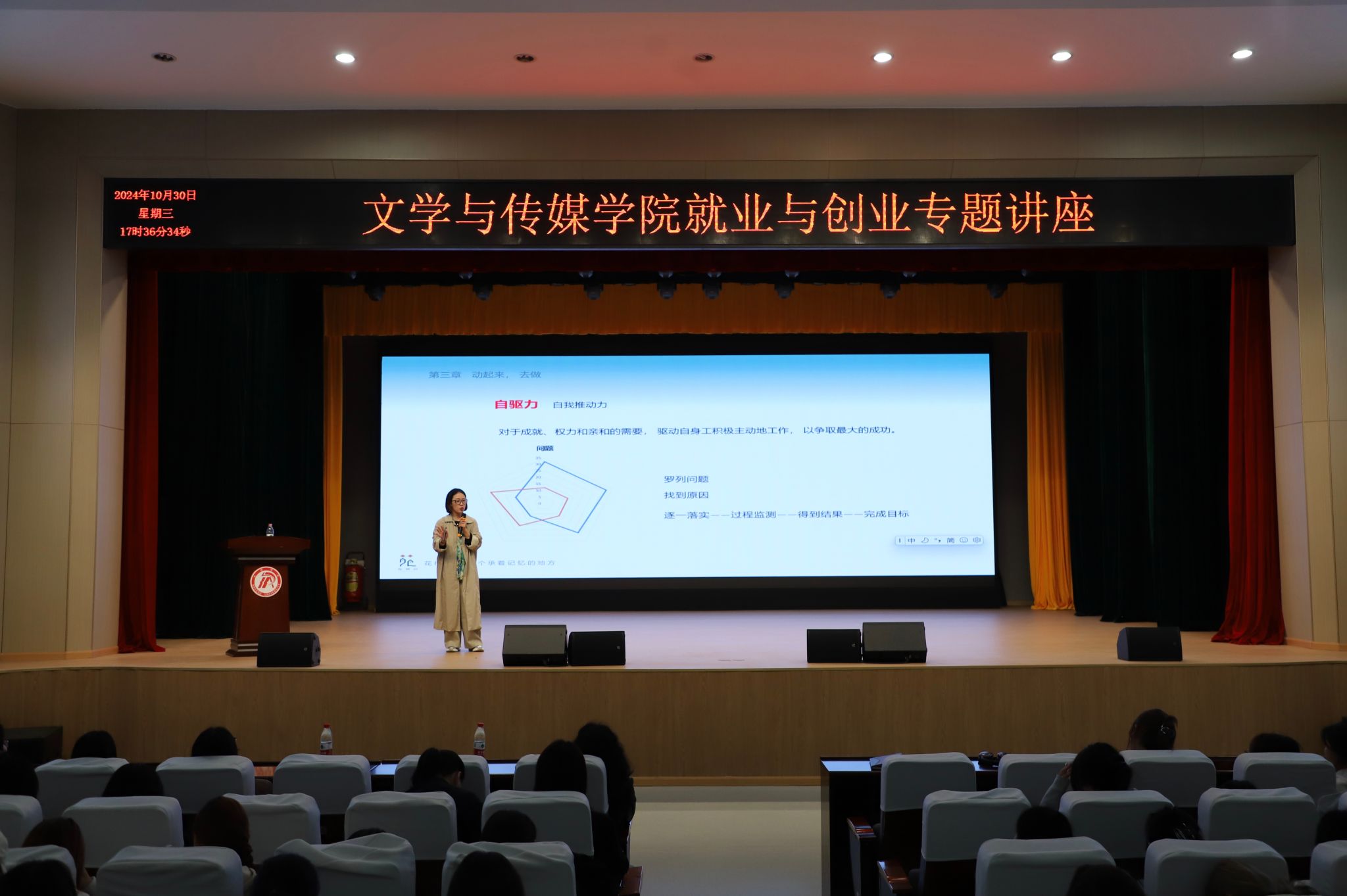 活动最后,杨海蓉作总结讲话。她希望同学们将讲座学习内容内化于心,外化与行,在今后的学习和生活中,注重实践锻炼,培养创新精神,树立正确的就业观念,努力成为更好的自己。