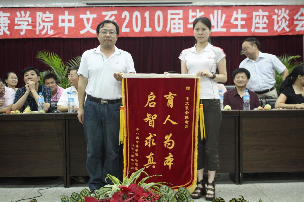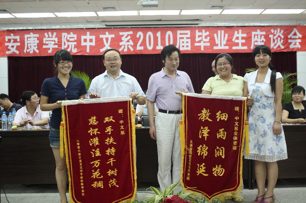 座谈会上,王瑛、孙鸿、李春平等老师作了发言,老师们殷切希望同学们心系母校,保持与母校的联系,常回家看看。毕业生结合自身学习和生活经历共同回顾了大学生活的点点滴滴和学院的发展变化,感谢几年来母校的培养和教导,是母校教会大家如何学习、如何生活、如何做人,是老师的传道、授业、解惑,为他们今后的成长发展打下坚实的基础。大家对老师们“以人为本”、兢兢业业的教学态度深表敬意。学院的人文关怀和细致周到的工作让大家在学习、生活上感到便捷和温暖。学生代表分别向学院和中文系赠送了锦旗,表达本届毕业生对学校的敬意和感激之情。