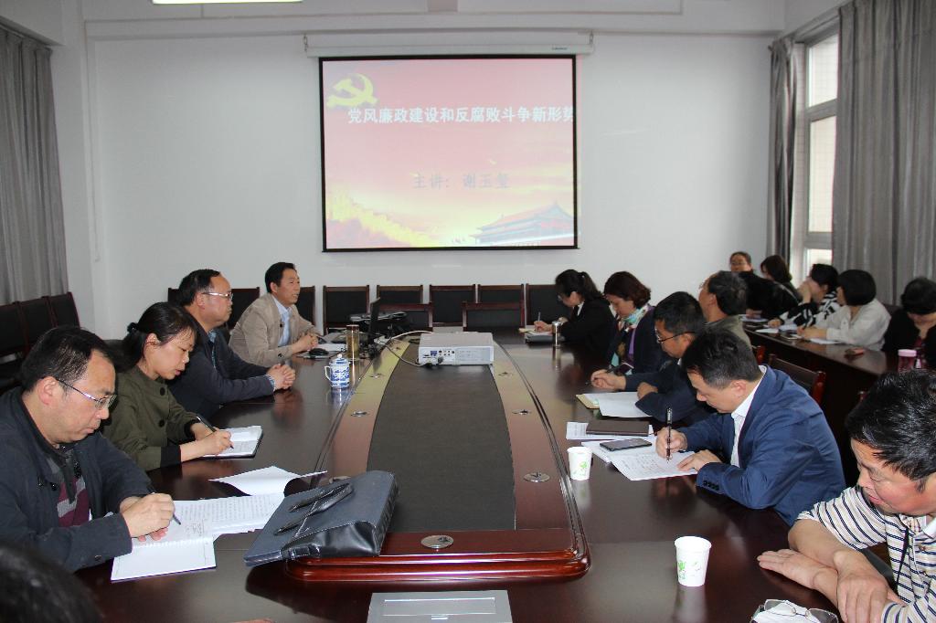 2017年4月26日下午,滚球买球官网在图书馆六楼陕南民间文化研究中心会议室召开政治理论学习会,学习贯彻中共十八届六中全会精神,滚球买球的app官网纪委副书记、监察处处长谢玉玺同志应邀做了“党风廉政建设和反腐败斗争新形势”的报告。会议由学院党总支书记于咏梅主持,学院全体领导干部、教职工参加了本次学习。