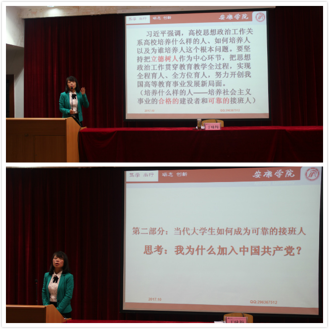 在随后的讲座中,于书记首先从习近平总书记在全国高校思想政治工作会议上的讲话精神引入,她指出,围绕立德树人的中心任务,高校应该培养社会主义事业的合格的建设者和可靠的接班人,本次讲座重点讲如何培养“可靠的接班人”。讲座内容分为两个部分。第一部分围绕“党的十八大以来砥砺奋进的五年”这一主题,从中国共产党为什么能、中国特色社会主义为什么行和中国梦为什么会实现三个方面进行了细致讲解。她强调习近平总书记发出“始终同人民想在一起、干在一起”的号召是中国共产党率领人民实现中国梦的政治本色和力量源泉,是以习近平同志为核心的党中央治国理政的鲜明政治本色,是“中国之治”的政治密码,也是建设中国特色社会主义的必然要求和实现人民共同富裕、促进人的全面发展的保障,是实现中国梦不竭的动力源泉。第二部分围绕“当代大学生如何成为可靠的接班人”这一主题,从中国共产党从哪里来、谈谈信仰和说说党章三个方面进行阐述,重点引导学生学习党的基本理论知识,不断端正入党动机,坚定共产主义理想信念。最后,于咏梅对加入党组织的具体流程以及如何撰写入党申请书进行讲解,鼓励学生积极递交入党申请书,争取早日成为一名入党积极分子。并告诫全体学生“现在,青春是用来奋斗的;将来,青春是用来回忆的。”
