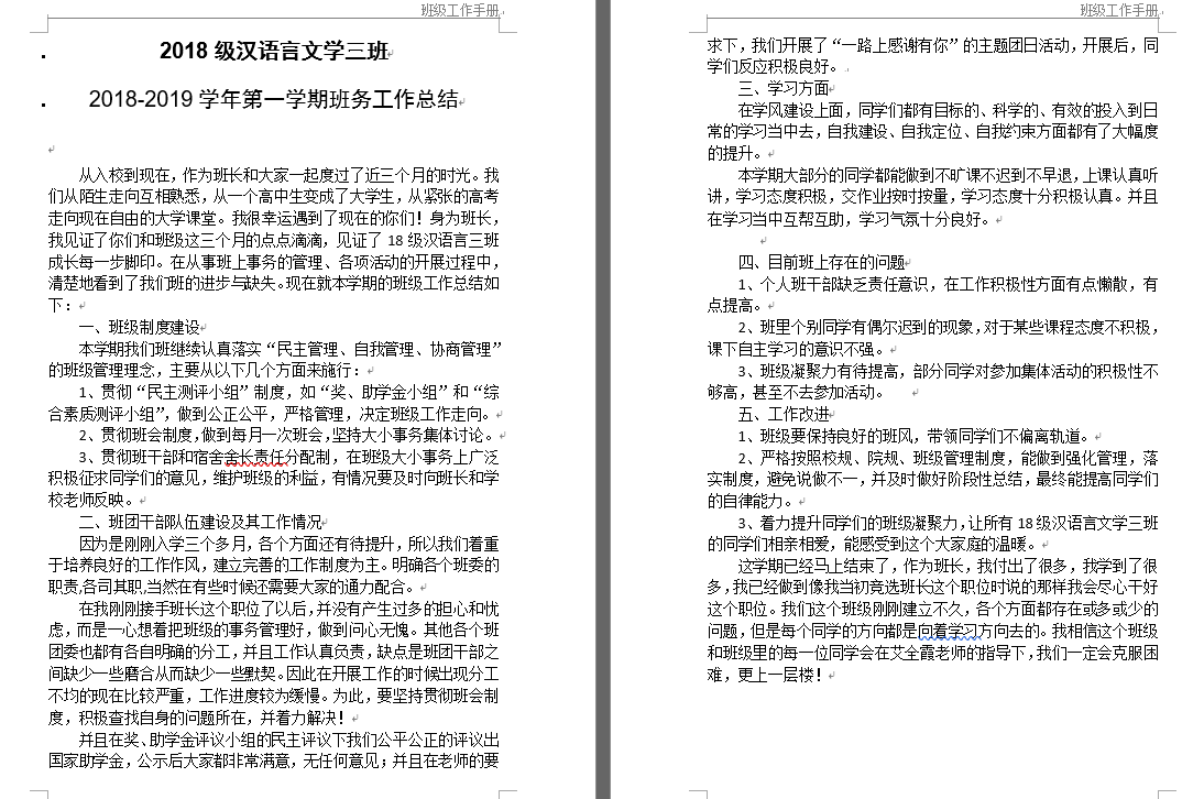经过学生评选,评委评选,本着公平公正公开的原则,按照学生打分占30%,教师打分占70%的比例,对2016、2017、2018三个年级共计十六个班级近一年来的工作手册进行了考核和打分,同时此项打分将按照一定的比例折算计入文明班级评选得分,作为班级考核材料让文明班级的评选更公平合理。评选中发现,各班工作手册排版美观、布局合理、条理清晰、图文并茂,内容完备,是班级成员一学期成就和班干部一学期工作成果的集中展示,按照班级建设理念与发展规划,也提出了下一学期的工作展望。
