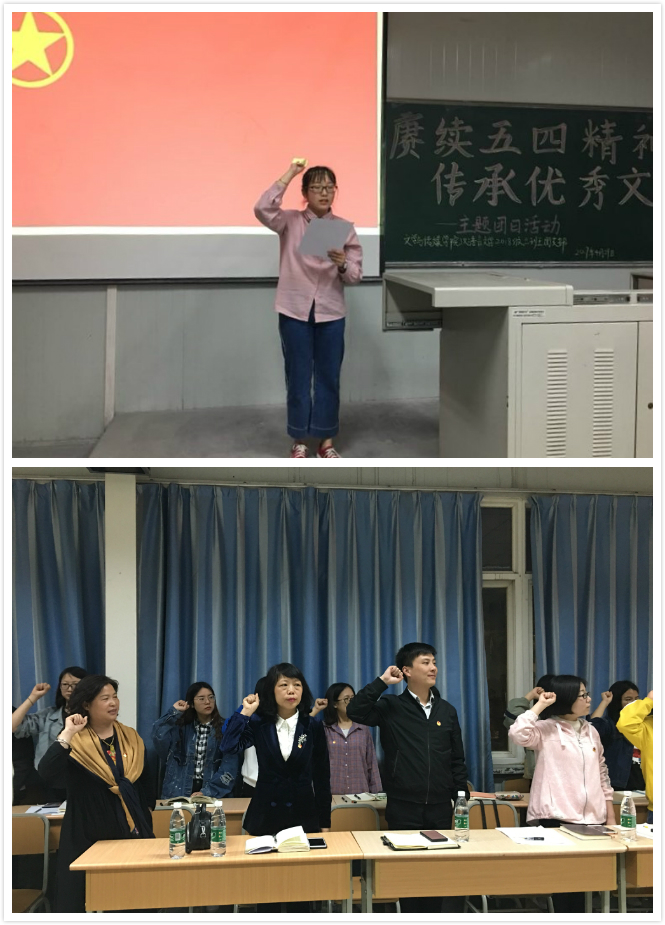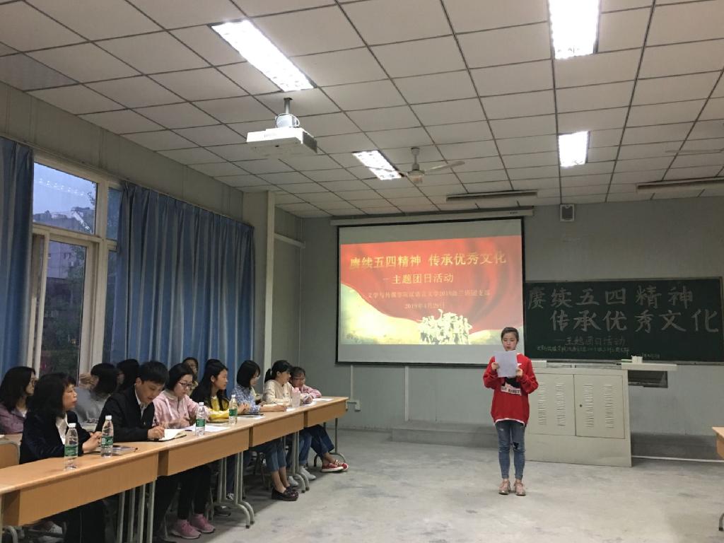 为纪念五四运动100周年,深入学习习近平总书记在中共中央政治局第十四次集体会议讲话精神,加强对五四运动和五四精神的学习理解,4月29日晚上七点半,滚球买球的app官网2018级汉语言文学专业3班在1024教室开展了“赓续五四精神,传承优秀文化”主题团日活动,滚球买球的app官网团委书记李光梓,滚球买球的app官网党总支书记于咏梅,团总支书记、学工办主任沈菲,滚球买球的app官网辅导员艾全霞,以及汉语言文学2018级3班全体同学参加了本次活动。