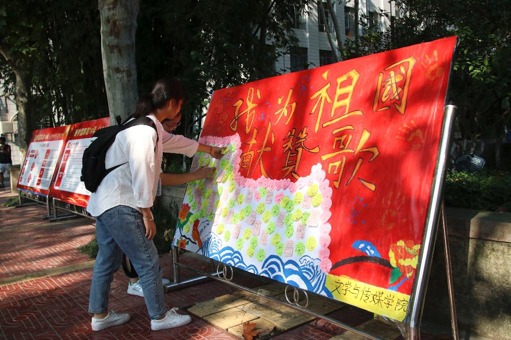 同日下午,在1026教室,滚球买球官网汉语言文学专业2019级四个团支部组织全体学生开展了以“庆新中国成立70华诞,抒新时代青年爱国情怀”为主题的祝福便签活动。学生们以稍显稚嫩的笔触,书写着自己对祖国母亲的依恋和祝福。活动结束后,团总支宣传部挑选出最佳的祝福便签,以展板形式在江南校区展出。