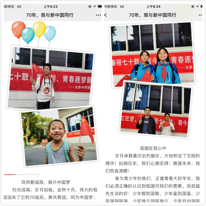 此外,滚球买球官网同步开展了线上活动。由网络与新媒体2018级1班团支部全程负责,2018、2019级各团支部参与,拍摄主题为“我为祖国献祝福”的短视频,随后在学院官方抖音账号上进行发布。同时,学院官方微信平台“爱中文”也面向全院发起主题征文活动,并将以“70年,我与祖国同行”为主题进行专题推送。