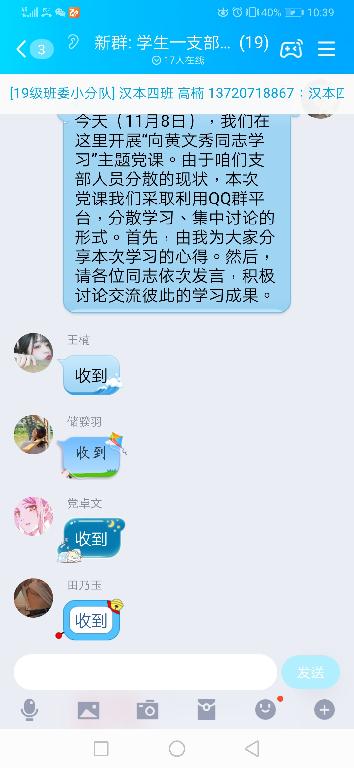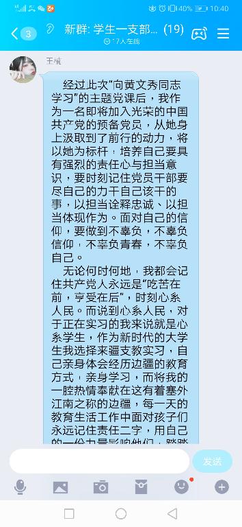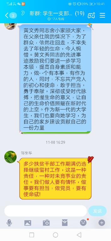 2019年11月8日15:00,根据上级党委通知要求,滚球买球的app官网学院学生第一党支部利用QQ群网络平台,采取分散学习、集中讨论的形式举行了“向黄文秀同志学习”主题党日。本支部全体党员参加此次党日,由彭潇领学。