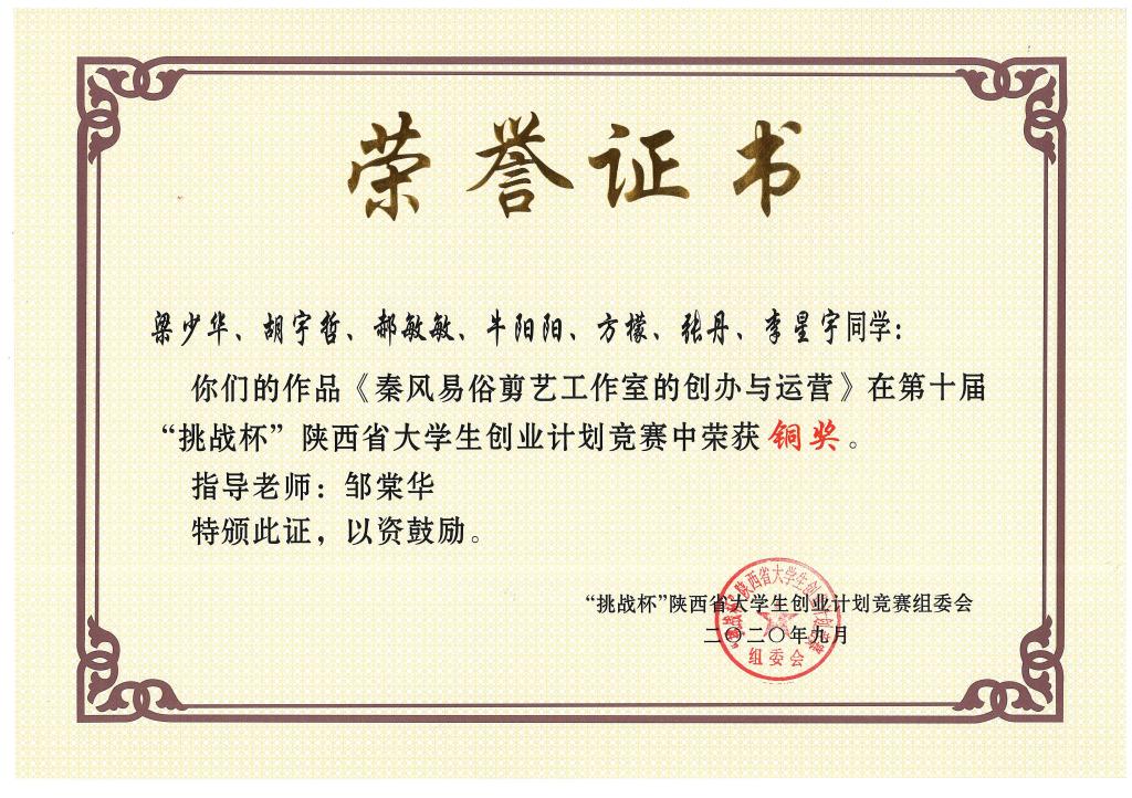 9月11日,大赛圆满落下帷幕,滚球买球的app官网参赛作品获银奖1项、铜奖6项。其中,由滚球买球的app官网邹棠华老师指导、2019级秘书学1班梁少华、胡宇哲等同学完成的参赛作品《秦风易俗剪艺工作室的创办与运营》获得铜奖。