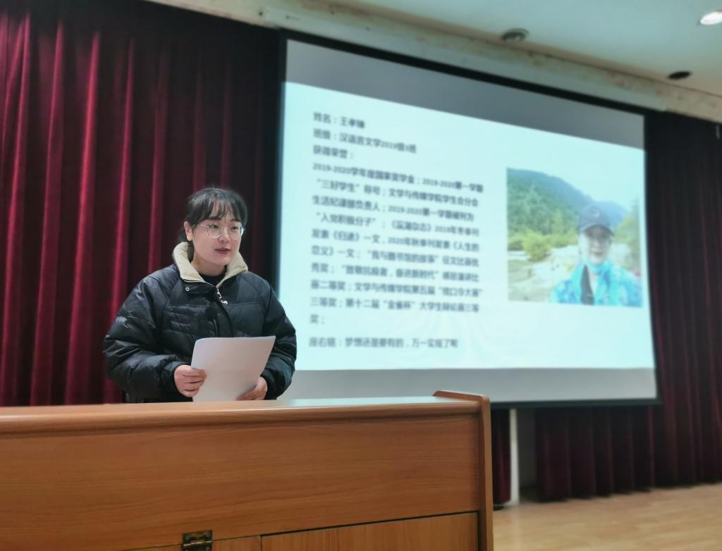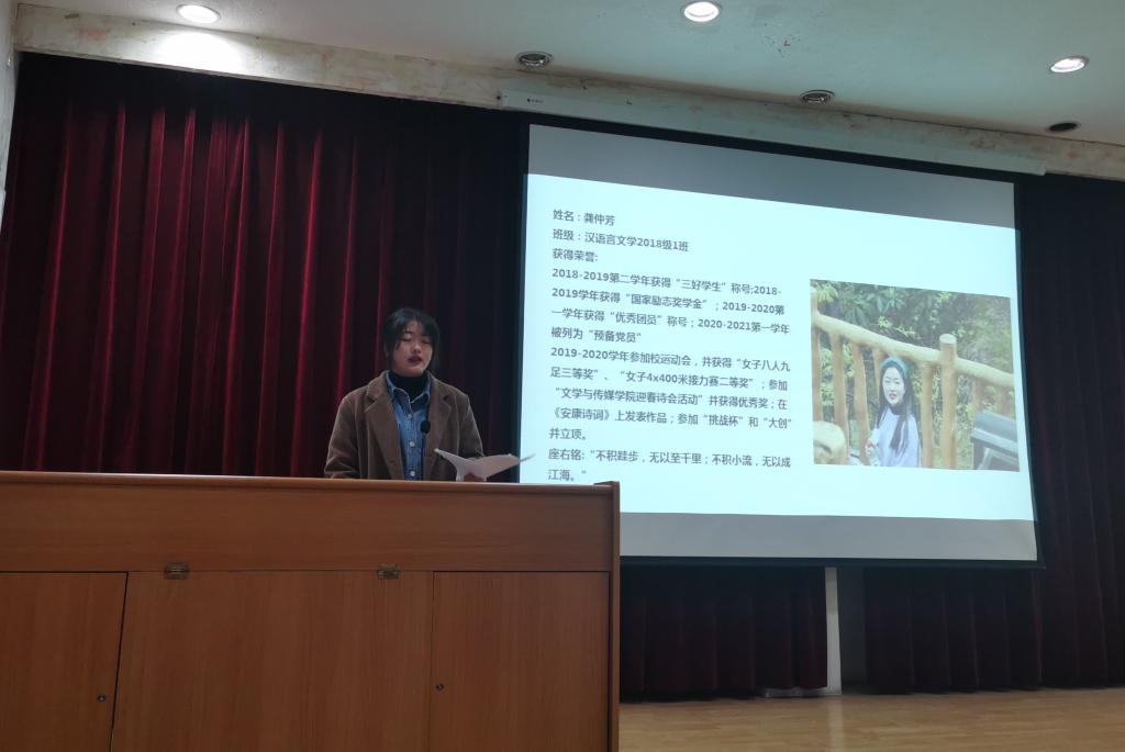 三名获得奖学金的学生代表为2020级新生作学习经验、学业规划经验交流分享。郭雅雯首先对党和国家的资助育人政策表示感谢,对学校的精心培养和老师辛勤工作表示感谢,建议2020级同学学会平衡学习和工作的关系。龚仲芳结合自己的学习经验为同学们分享了三点学习心得:一是要博览群书坚持写作锻炼写作能力;二是要树立明确目标,结合自身发展规划,考取必要的资格证书;三是要学会劳逸结合,保持良好心态,敢于挑战自己。王孝瑧谈到获得国家奖学金荣誉,源于老师的悉心指导、同学的帮助与肯定,也源于自身的坚持与努力。并将以此为动力,去努力实现目标,不断成长,同时也带动身边的同学不断进步。并建议同学们做好时间管理,保持自律,向课堂要效率,形成自己的逻辑框架。