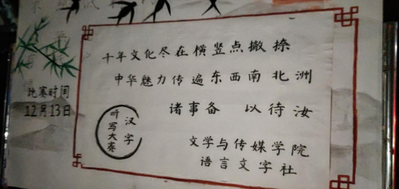 我们中国的汉字,落笔成画留下五千年的历史。为传承语言文化,展现汉字魅力,滚球买球的app官网滚球买球的app官网隶属的语言文字社于江南校区举办了以“千年文化尽在横竖点撇捺,中华魅力传遍东西南北洲”为主题的汉字听写大赛活动。