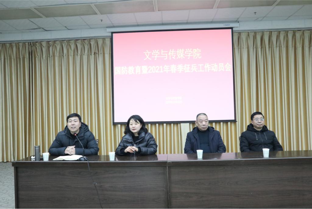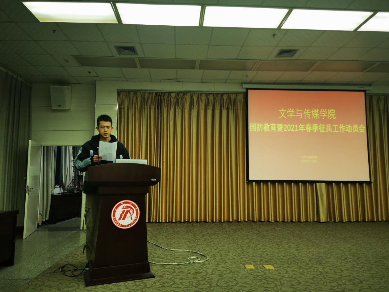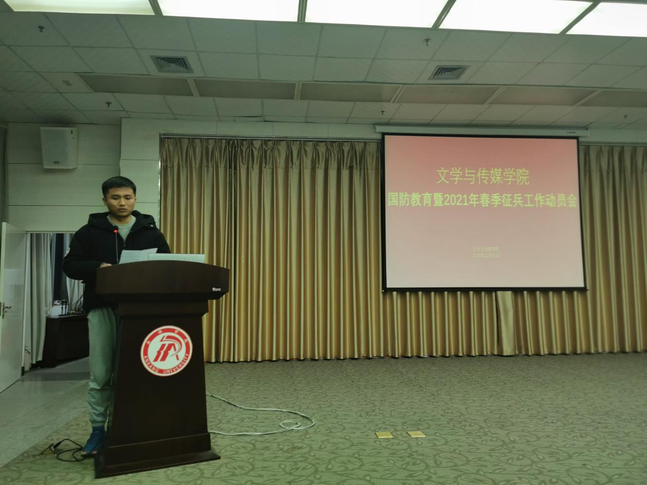 为进一步贯彻落实《新时代爱国主义教育实施纲要》要求,加强新时代大学生爱国主义教育,增强国防意识,激发广大青年大学生积极响应祖国号召参军入伍,保家卫国,2020年12月30日晚19:30,滚球买球的app官网联合学工部在图书馆六楼报告厅召“开国防教育暨2021年春季征兵工作动员会”,学工部王瑞卫,滚球买球的app官网学院党总支副书记杨海蓉、学工办副主任薛涛、辅导员邹棠华老师,退伍大学生代表冯瑞瑞、赵天齐及全院有志参军的200余名同学参加会议。会议由薛涛主持。