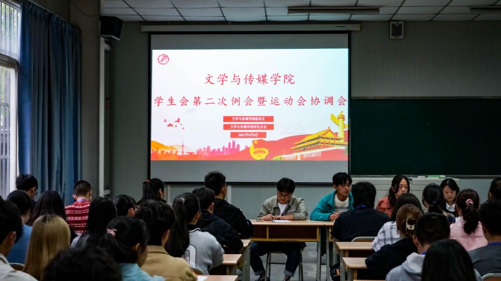 2021年4月9日下午18:00,滚球买球的app官网学生分会第二次例会暨运动会协调会在江南校区1014教室召开。党总支副书记杨海蓉、学工办副主任薛涛、团总支书记彭潇出席会议,滚球买球官网第15届团总支、学生分会全体成员,九大社团负责人参加会议。会议由主席团成员邓博予主持。