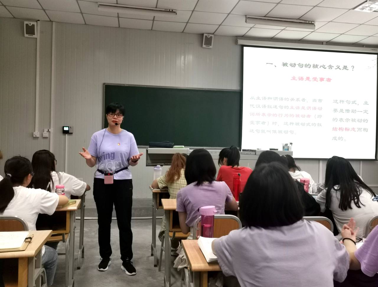 活动第一环节(8:00—8:50)为观摩周海霞主讲的古代汉语课。周老师结合课前学生在线视频自学情况,以超星智慧教学app为依托,通过线上测试—现场问答—师生研讨—知识总结的方式完成了对被动句的讲授。本节课知识容量大、案例丰富、学生参与度高,课堂氛围及教学效果优良。