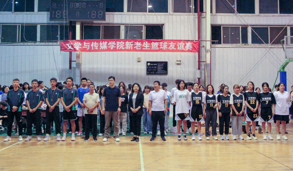 为积极响应习近平总书记提出的体育强国战略号召,营造“全民全运”大健康氛围,丰富学生第二课堂建设,助力学生全面发展。9月17日晚19:30,滚球买球的app官网在江南校区体育馆二楼举行“迎国庆·庆中秋——滚球买球的app官网新老生篮球友谊赛”,由学院大二、大三、大四年级组成的老生代表队和2021级新生代表队参加了此次活动。党总支书记芦伟、党总支副书记杨海蓉、学工办副主任薛涛、2021级新生辅导员邹棠华及2021级全体新生到场观赛。此次友谊赛由网络与新媒体2020级1班胡文婷主持。