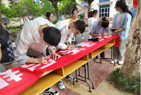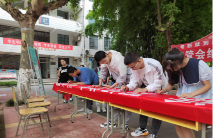 由语言文字社社长带领社员于9月15日在一号餐厅外拉开“普通话诵百年伟业,规范字写时代新篇”横幅,组织校内学生在横幅上签字和留影。在此期间更是吸引了校内外国留学生的注意,积极参与普通话的推广与规范字的学习,宣传了我国优秀的传统文化。