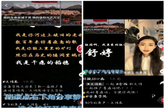 除了一系列线下的推普活动,语言文字社还紧随时代潮流,利用当下流行的抖音合拍功能,进行了普通话的推广。通过剪辑视频发送至滚球买球的app官网官方抖音,号召全校师生进行合拍朗诵,达到推广普通话的目的。视频一经发出,就受到了广泛的关注,同学们也积极进行了线上朗诵合拍。