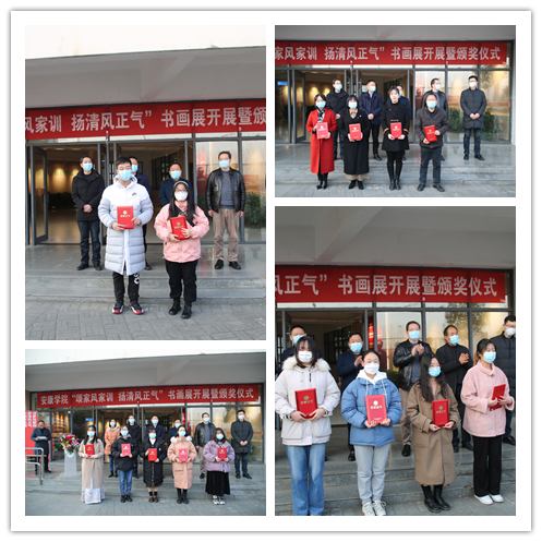 谢玉玺宣读了《关于对“我的家风故事”征文及“颂家风家训 扬清风正气”书画作品评选活动获奖作品进行表彰的决定》,与会领导为获奖师生代表颁奖并合影留念。“我的家风故事”征文活动教师组一等奖获得者余珊,“颂家风家训 扬清风正气”书画作品评选活动学生组专业作品二等奖获得者冯森分别代表获奖师生发言。余珊老师发言表示,通过本次征文活动深刻感悟到家风家训的文化内涵,并对家风家训有了更深一层的认知,获益匪浅。在今后的工作学习中,融入家风家训优秀文化,以知促行,弘扬优秀传统美德。
