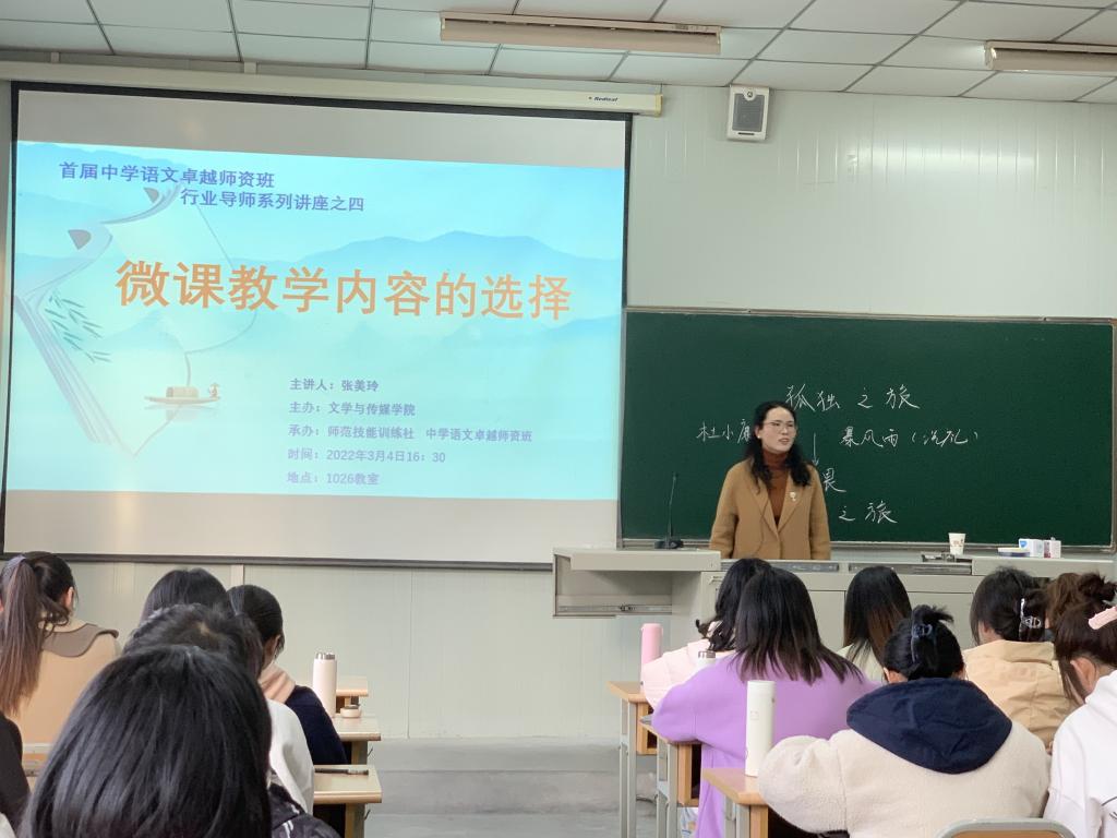 新学期伊始,按照“中学语文卓越师资班”人才培养计划方案,3月4日下午4点,滚球买球官网特邀安康市汉滨初级中学优秀教师,陕西省语文教学能手张美玲老师在1026教室开展了题为“微课教学内容的选择”的专题讲座活动,活动由中学语文卓越师资班班主任张格瑄老师主持。