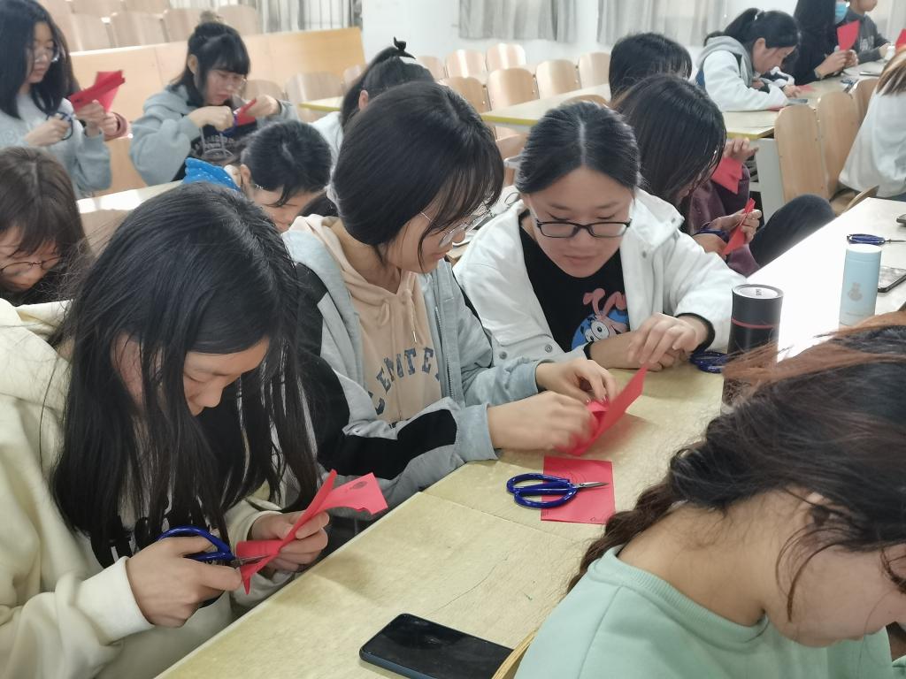 活动伊始,梁少华首先解读了“非遗”的概念,以有奖问答的形式与同学们展开讨论。随后,梁少华系统介绍了剪纸的种类、形式和文化底蕴,现场展示了多种剪纸形式,激发了同学们对剪纸的兴趣。纸上得来终觉浅,在同学们掌握基本理论方法后,梁少华分发剪纸模板和剪刀,引导同学们对折纸张、仔细构思,按照步骤和方法孵化出一个个惟妙惟肖、栩栩如生的作品。