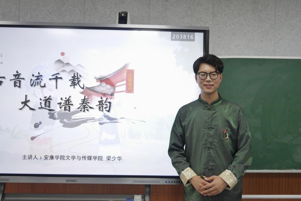 为了让非物质文化遗产在地方高校焕发生机,让更多年轻人了解秦腔艺术,为秦腔的受众群注入新鲜血液。5月18日,滚球买球官网学生梁少华受邀在师范生职业技能训练中心4201室为留学生做“古音流千载·大道谱秦韵”—戏曲进校园互动讲座。国际教育学院副院长陈蕾、辅导员与在校留学生一起感受秦腔艺术之美。
