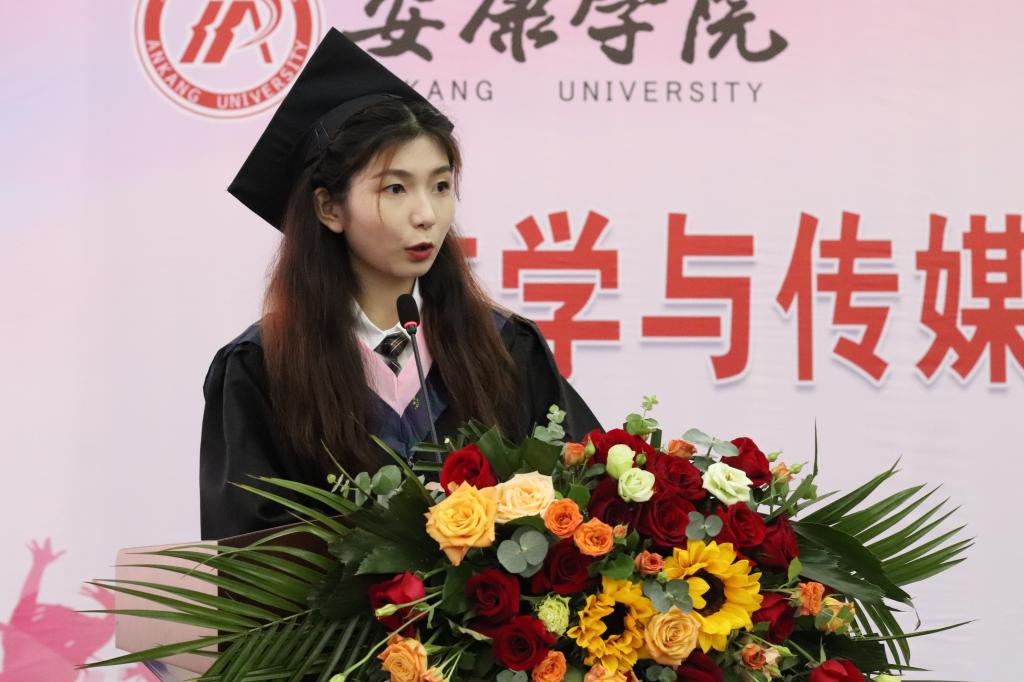 秘书学专业于家彬代表2022届全体毕业生对辛勤培育自己的老师表达了由衷的感谢,她表示将带着文传学子自信、向上、奋斗的精神风貌,以实际行动践行“笃学、尚行、砺志、创新”的校训,关注时代的巨变,顺应时代的号召,坚定信念跟党走,在接续奋斗中继往开来,承载起青年一代的使命担当。