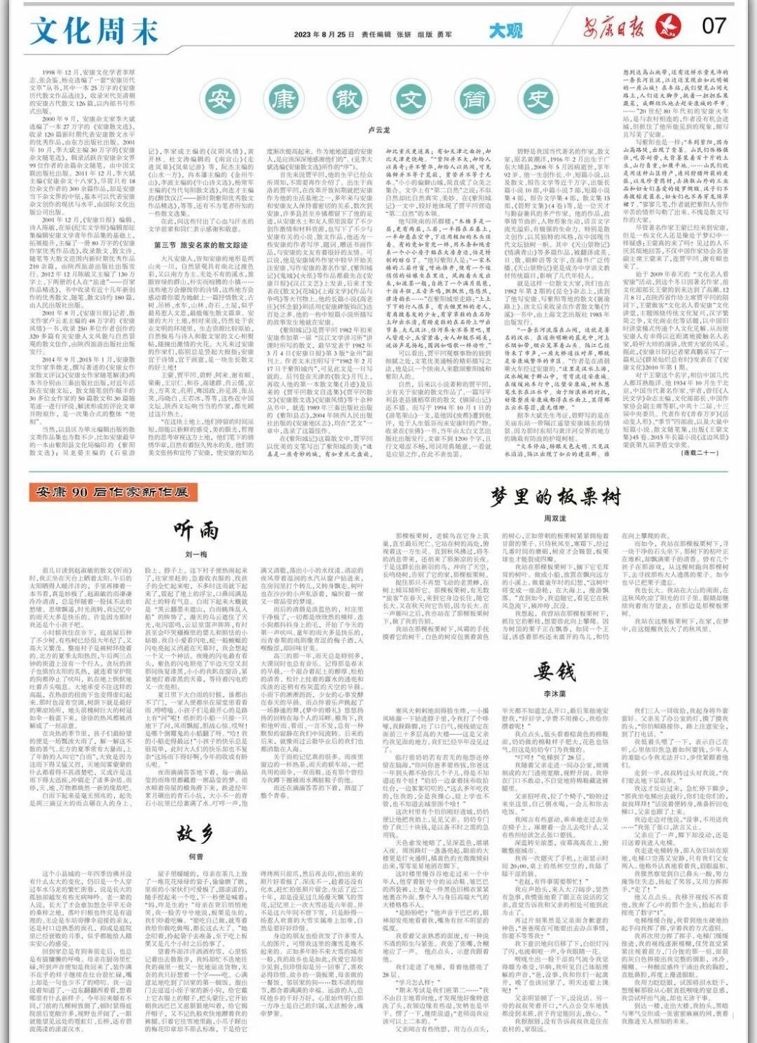 导航痕迹 首页 > 新闻通知 > 学院新闻 > 正文 学院新闻 通知公告 心怀文学梦,执笔写风华 发布人:滚球买球的app官网 发布日期:2023年09月01日 阅读次数: 2023年8月25日,滚球买球的app官网四位学子的文学作品在《安康日报》刊登,作者及作品为周双泷《梦里的板栗树》、刘一梅《听雨》、李沐蕖《要钱》、何曾《故乡》。 为培养“能说、会写、善教”实践能力突出的专业人才,滚球买球的app官网持续提高学生的学科素养能力,突出汉语言文学专业的特色与优势,注重对学生写作能力的濡染熏陶。文学创作社以提高文学素养,促进写作能力为目标,定期举办各种文学竞赛活动。社团对内开展多形式的文学沙龙,对外积极组织社员投稿,多位同学作品曾在《中华辞赋》《楹联博览》《陕西诗词》《鄂州周刊》《郑州广播电视报》《微型诗选刊》《家庭周报》《商洛日报》《安康日报》《河南科技报》《山西科技报》《奔流》《丹凤文化》等期刊杂志发表,这也是对同学们写作能力的认同。在学院的支持和同学们笔耕不辍的努力下,文学社成员收获良多。滚球买球的app官网坚持守正创新,师生共同努力创作大量优秀文学作品。教师们以丰富的专业知识、深厚的教育情怀和极强的实践能力提供了良好的学习氛围,培养学生理论与实践同步提升。 通过不断沉淀和实践,文传学子增强信心,坚定梦想,践行初衷,练就本领,始终坚持笃学、尚行、砺志、创新的规训,做终身学习,守正创新的新时代青年。 安康日报电子版链接:http://sjk.akxw.cn/epaper/read.do?m=i&iid=2473&eid=17816&idate=1_2023-08-25 撰稿/何曾 审校/杨海蓉 发布/崔瑜