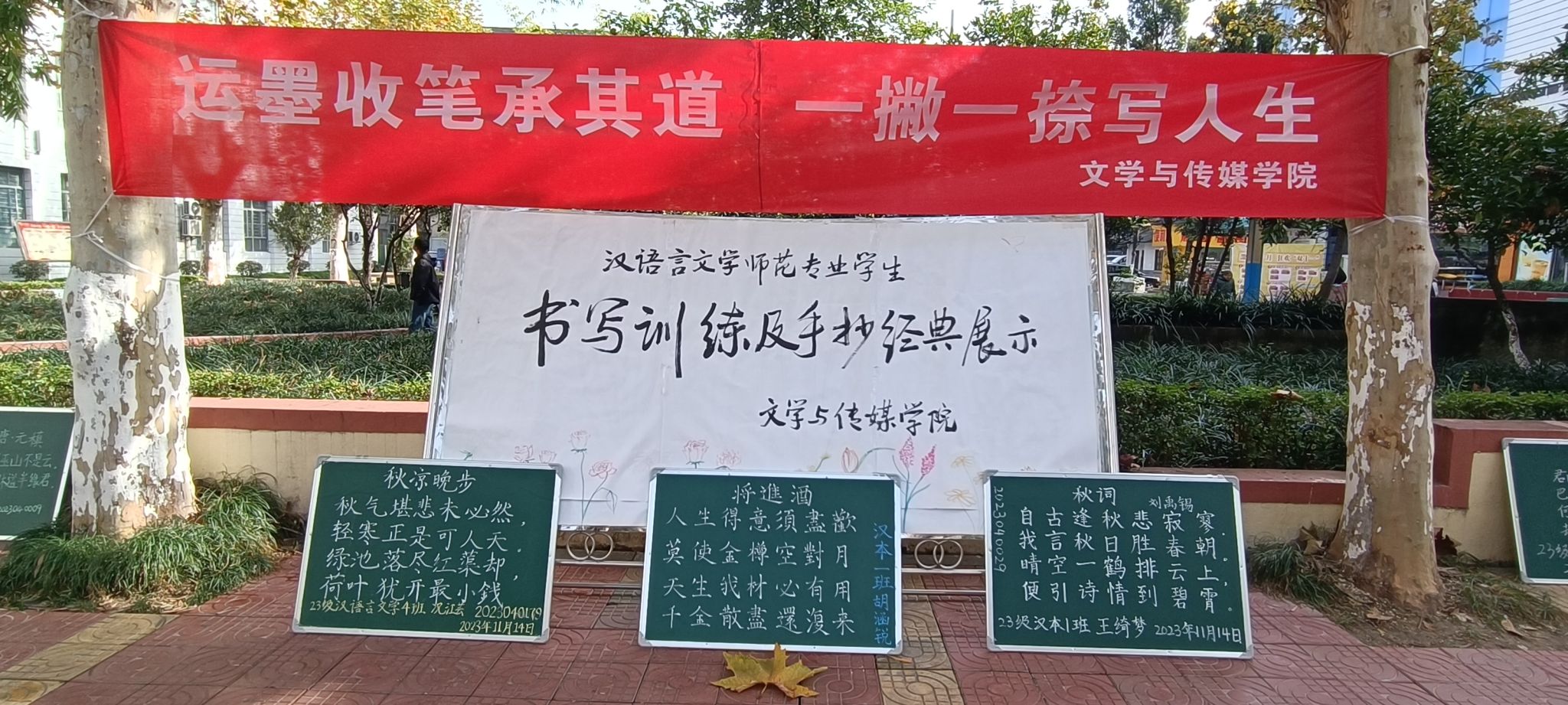 为了弘扬中华优秀传统文化,提高汉语言文学师范专业学生的书写水平,促进同学们相互学习共同进步的良好学风,11月中旬,我院组织举办2023级汉语言文学专业师范生板书训练及手抄经典展示活动。活动主题为“运墨收笔承其道,一撇一捺写人生”。