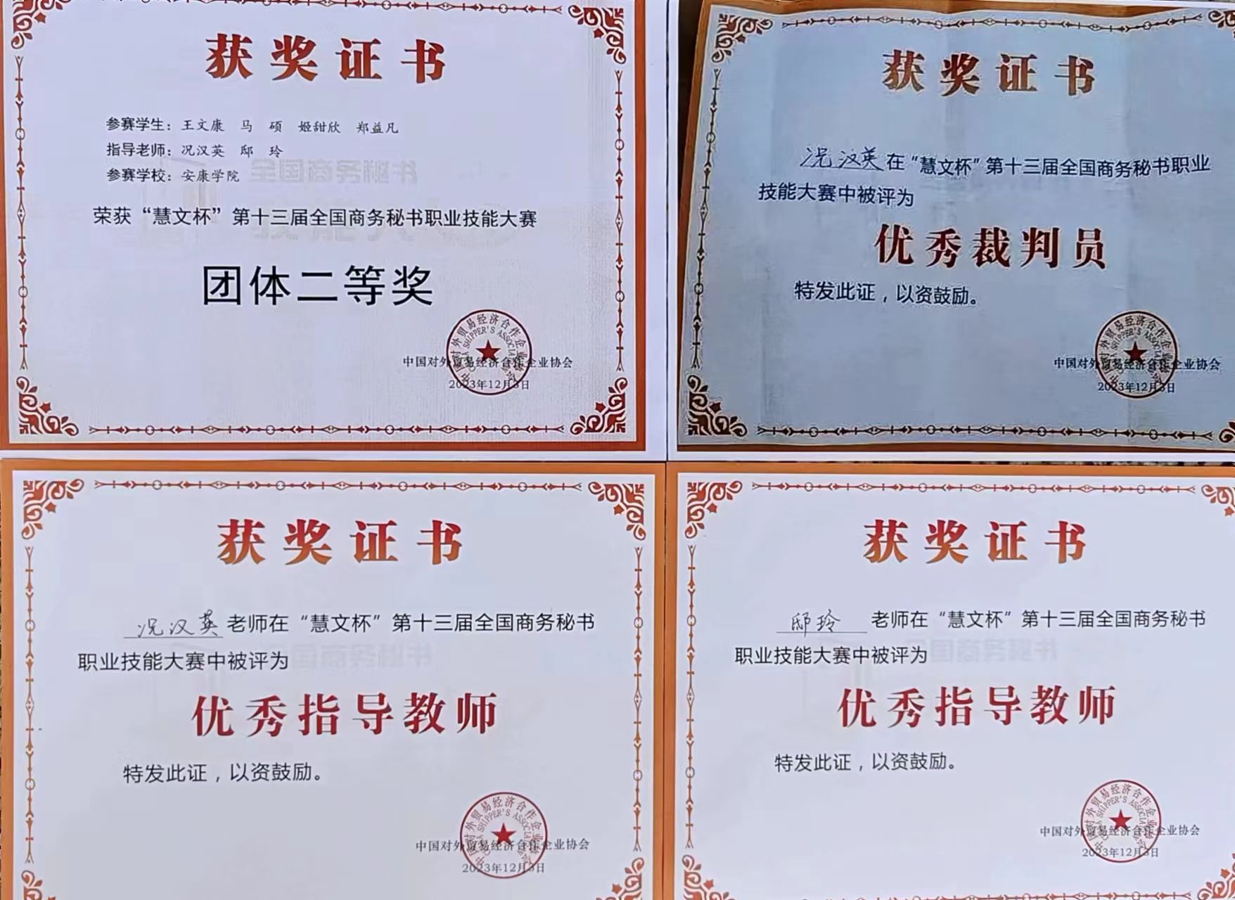“慧文杯”第十三届全国商务秘书职业技能大赛于2023年12月1日至3日在浙江警官职业学院隆重举行,来自全国近600名师生相聚西子湖畔同台竞技。大赛由中国对外贸易经济合作企业协会主办,浙江警官职业学院和全国商务秘书与行政助理专家委员会承办,中国对外贸易经济合作企业协会外经贸从业人员考试中心协办。滚球买球的app官网滚球买球的app官网代表队在本次全国商务秘书职业技能大赛中再创佳绩,荣获“团体二等奖”。