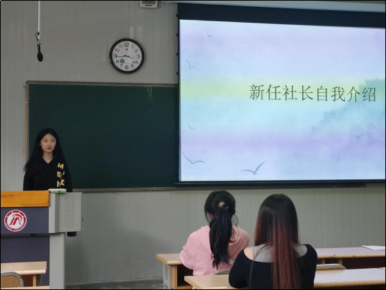 会议第一项,现任社长李梦菲对新社员们的加入表达了热烈的欢迎并向新社员们介绍了社团情况,之后从活动的开展及存在的问题等方面对过去一年的工作进行了总结说明。