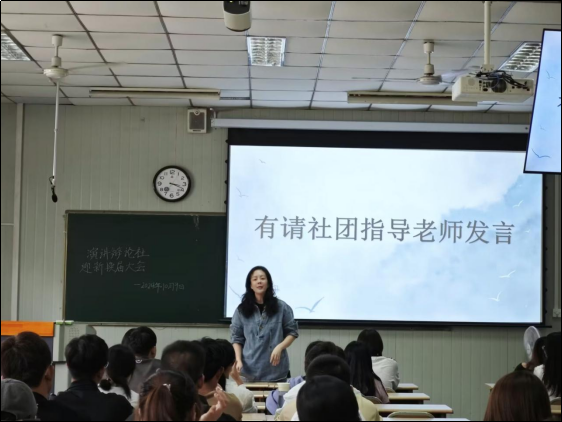 会议第三项,由社团指导老师余珊老师为此次迎新暨换届大会进行总结发言。她为新社员们介绍了社团接下来要承办的主要活动,并对社团未来的发展提出了殷切期望。