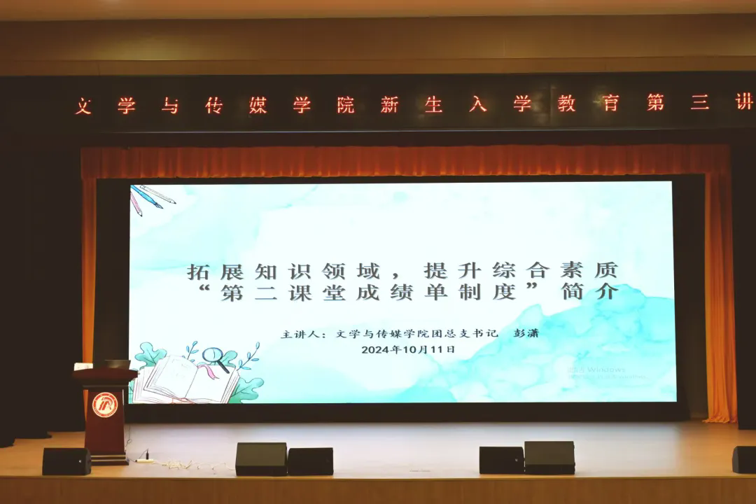 为全面提高新生综合素质,以完备、科学的“第二课堂成绩单”制度体系提升第二课堂育人实效,2024年10月11日下午,滚球买球的app官网在江南校区大礼堂开展新生入学教育第三讲:拓展知识领域,提升综合素质——“第二课堂成绩单制度”简介。滚球买球官网团总支书记彭潇主讲,辅导员喻言、刘言军和2024级全体同学参加,会议由刘言军主持。