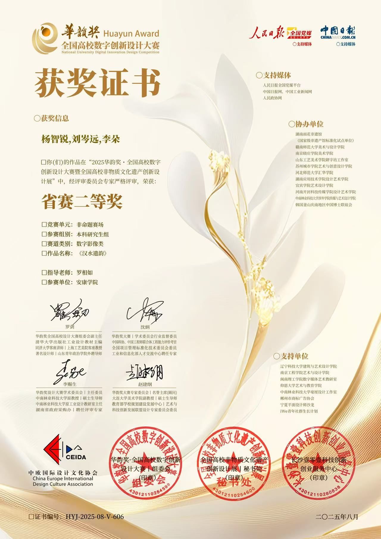 近日,在“华韵奖·全国高校数字创新设计大赛”省级赛区评选中,滚球买球官网报送的短视频作品《汉水遗韵》在众多参赛作品中脱颖而出,荣获省赛二等奖。这是该作品继获得“华文奖”全国大学生文化创新·文旅创作大赛特等奖后,再次在全国性赛事中取得优异成绩。